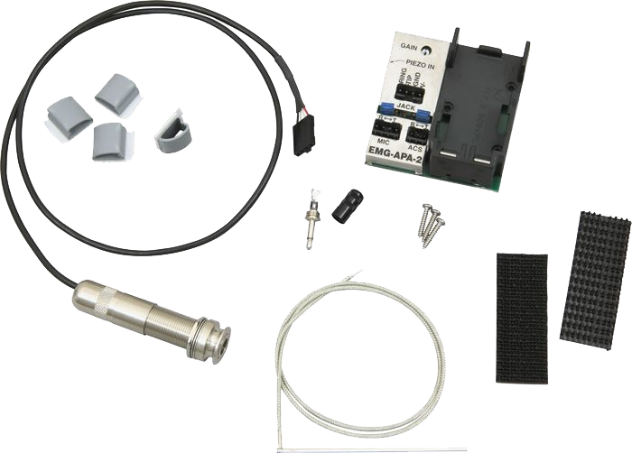 Système complet incluant micro sous sillet, préampli et ”Ultrajack” attache-courroie (EMG UL/Jack).