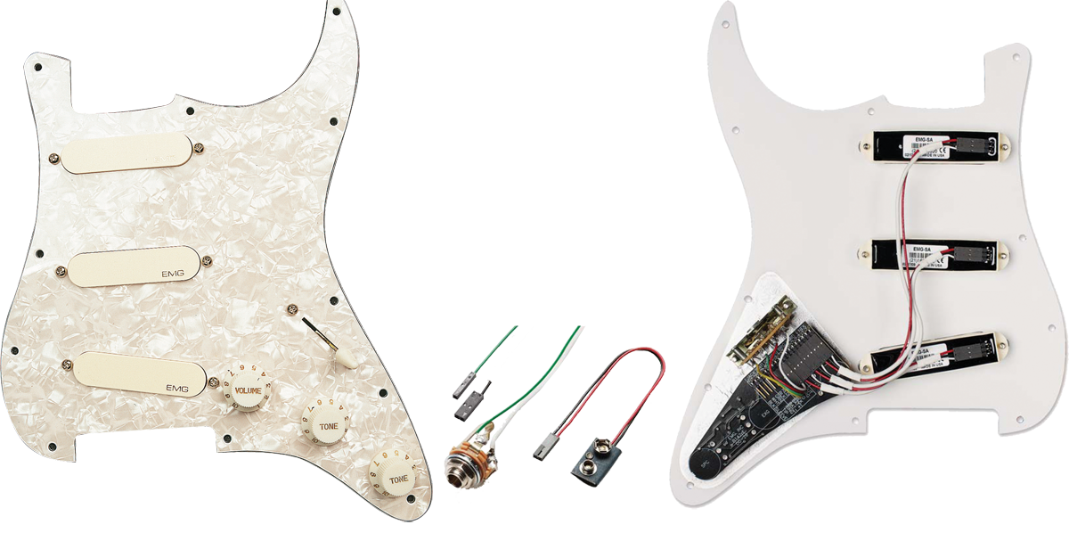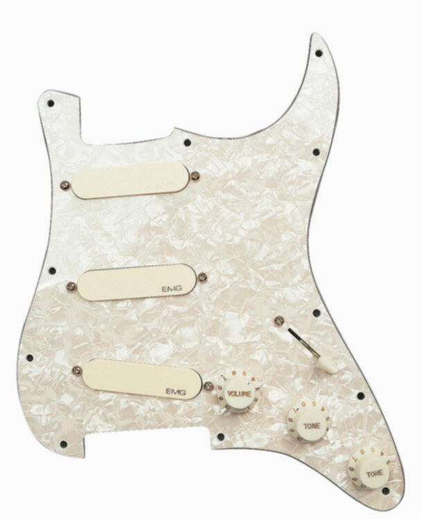 - 3 micros EMG SA, capots couleur crème (son Strat sixties) - 1 SPC : contrôle actif de présence - 1 EXG : contrôle actif graves/aigus - 1 potentiomètre de volume - 1 plaque forme Strat nacrée.