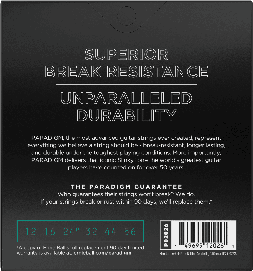 Les cordes PARADIGM, issues d'un procédé de fabrication inventé par Ernie Ball, sont plus résistantes et préservent 100% de votre jeu et de vos sensations.
