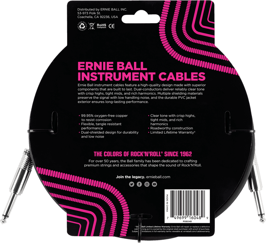Ernie Ball 6062 Jack/jack coudé 7,62m noir et rouge Gaine Tissée