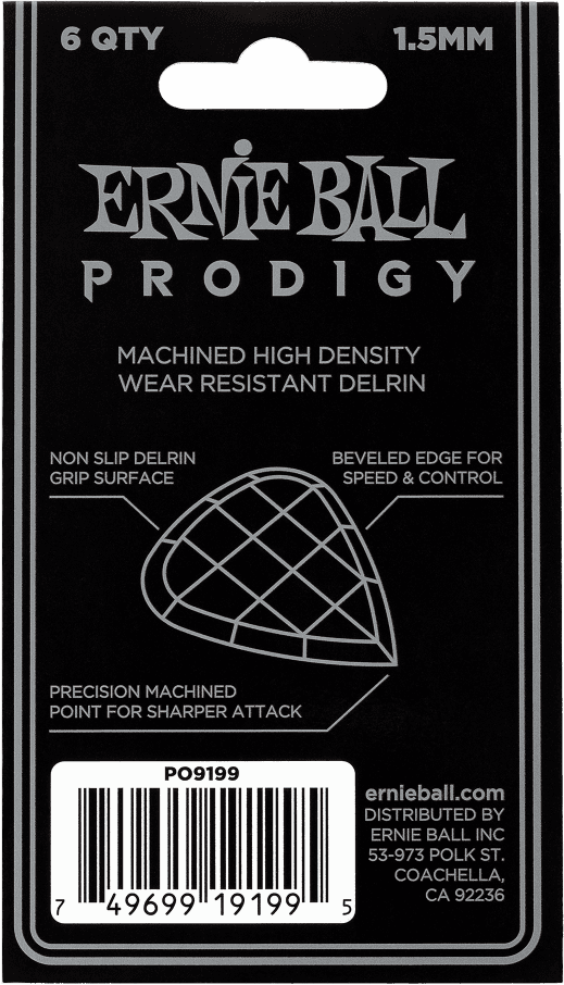 Les médiators Prodigy, conçus à base de Delrin (résistance et surface anti-dérapante), possèdent des bords biseautés qui permettent de réduire la casse des cordes, et d'offrir un meilleur confort de jeu.