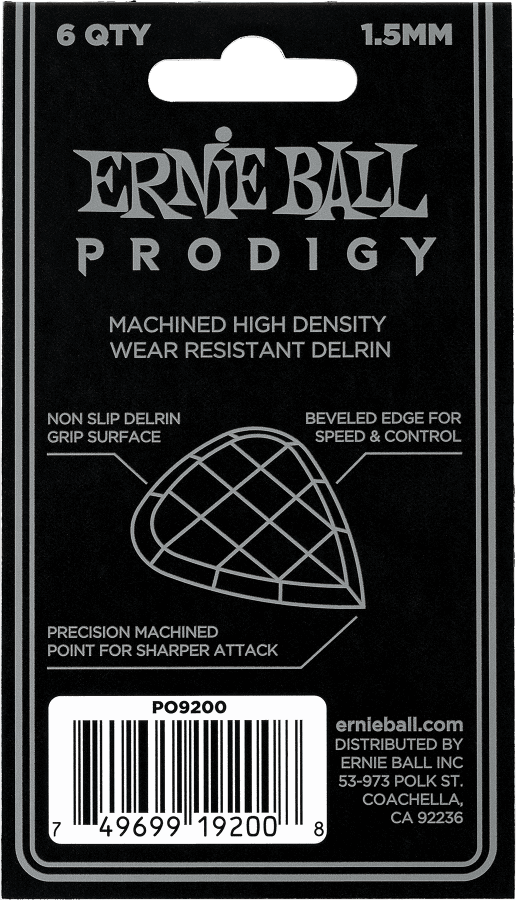 Les médiators Prodigy, conçus à base de Delrin (résistance et surface anti-dérapante), possèdent des bords biseautés qui permettent de réduire la casse des cordes, et d'offrir un meilleur confort de jeu.