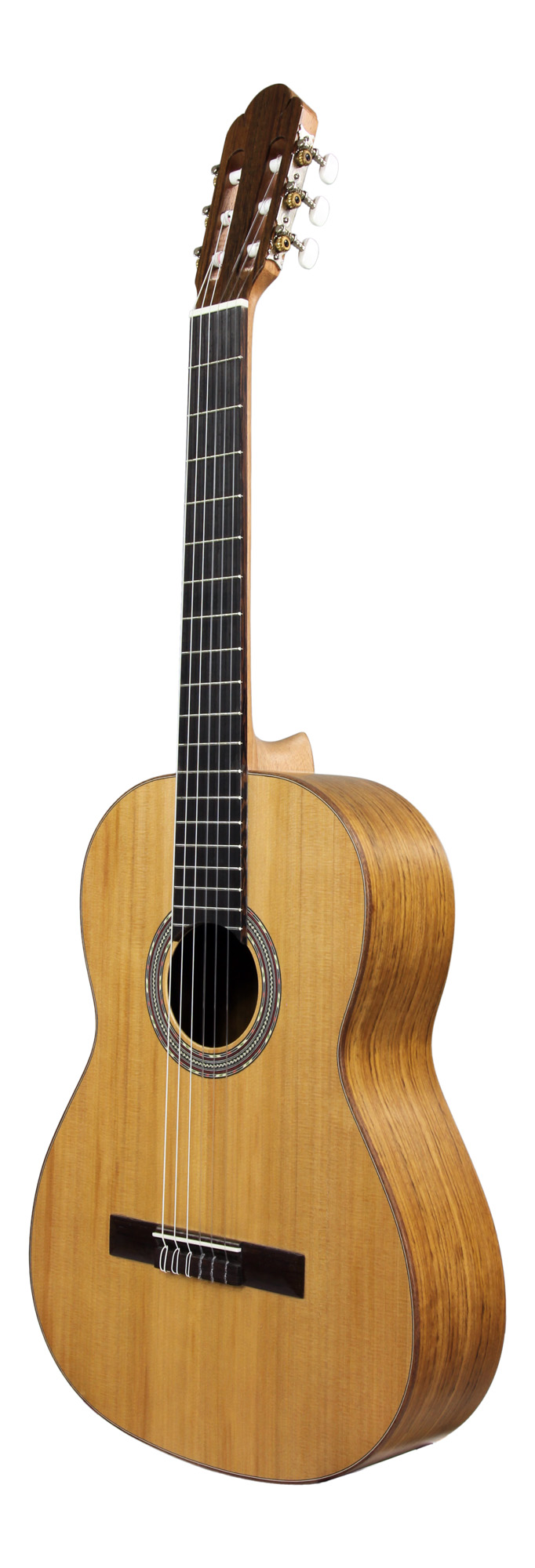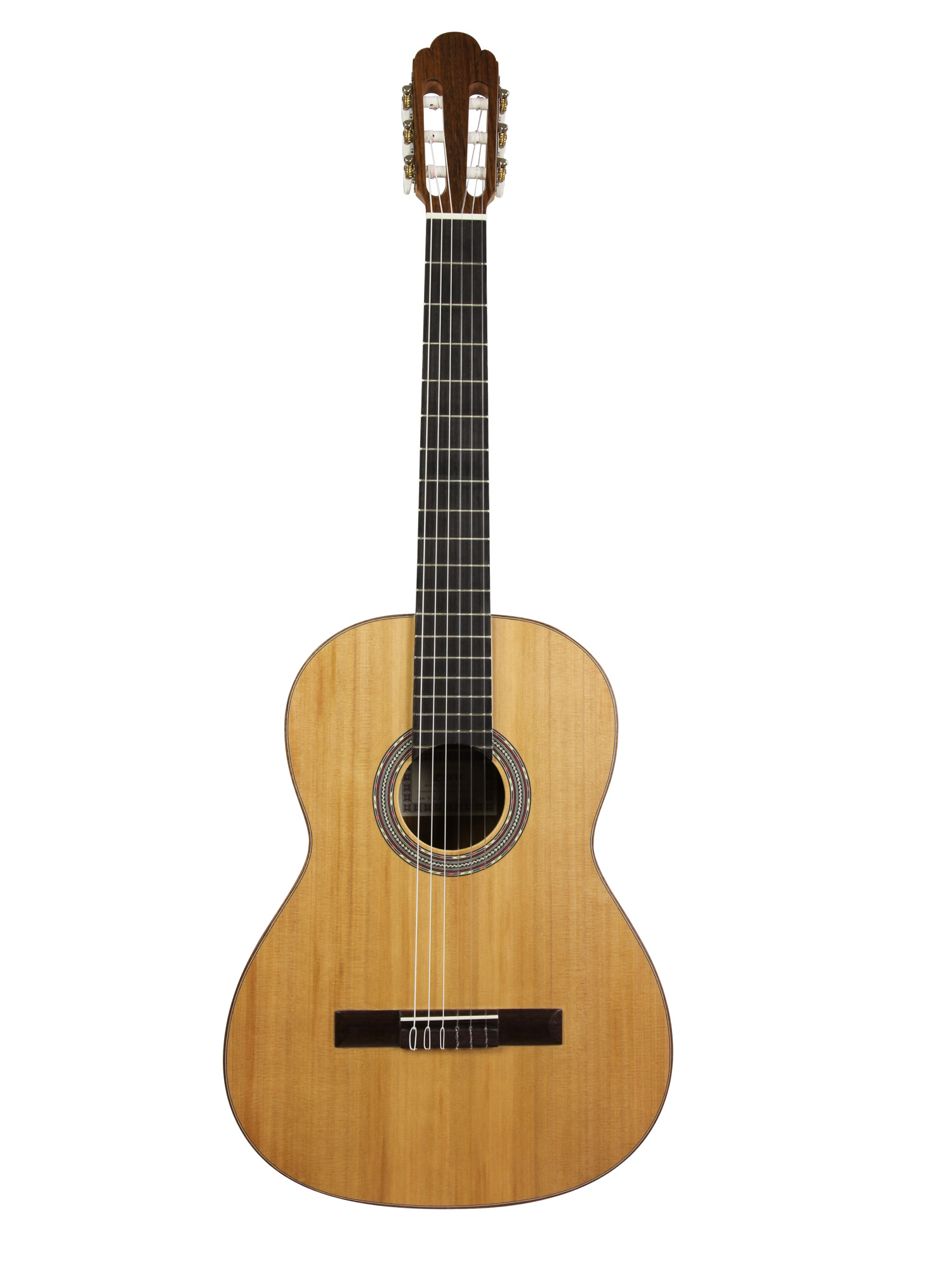 Modèle TURIA, table cèdre massif, fond et éclisses mongoy, manche okoumé, sillet 50 mm, touche et chevalet wengé, sillets os, cordes Savarez Corum.