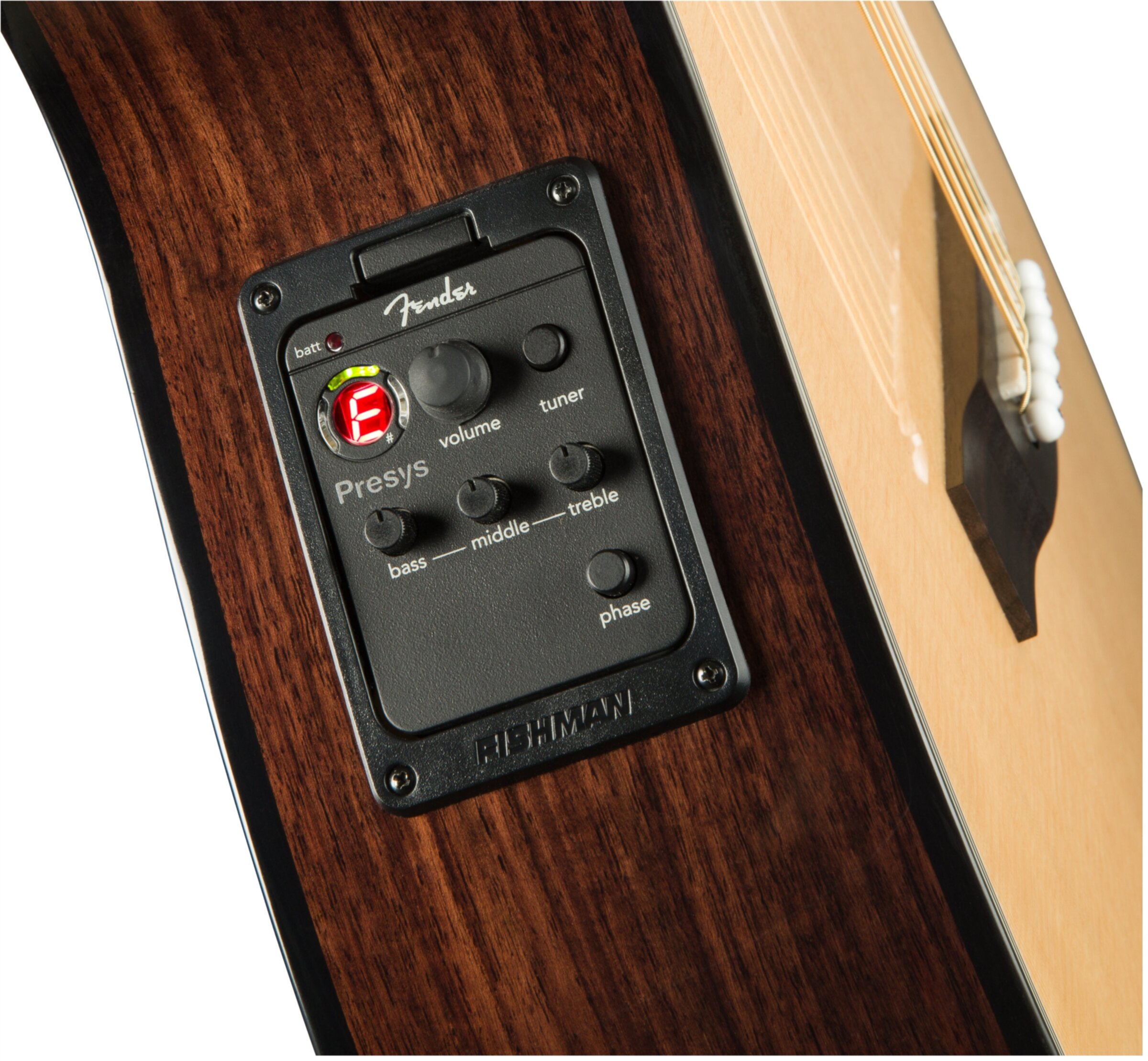 Table en épicéa massif Fond et éclisses en palissandre laminé Manche en acajou Touche palissandre 20 frettes style Vintage Diapason: 597 mm (23,5") Chevalet en palissandre Système de micro Fishman Presys avec préamplificateur actif et accordeur intégré Cordes Fender DuraTone .012 - .052 Couleur: Naturel haute brillance Livrée en étui