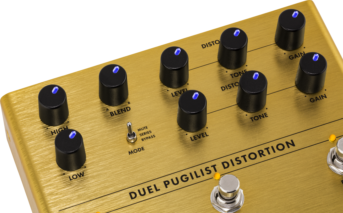 Entrez dans l’arène avec cette double pédale de distorsion. La Duel Pugilist reprend les effets de saturation de notre célèbre pédale Pugilist, et y ajoute de nouvelles combinaisons qui laisseront votre public sans voix. La Duel Pugilist offre trois modes d’opération : en série, Mute et en parallèle. Le mode en série permet de superposer deux distorsions, comme si vous aviez deux pédales distinctes, tandis que le mode en parallèle sert à mélanger deux distorsions différentes, ou un son clair et un son saturé. Le mode Mute vous donne la possibilité d’utiliser une distorsion pour élaborer votre son principal, puis d’ajouter une distorsion supplémentaire pour obtenir un son plus riche et complexe. Un égaliseur global de deux bandes en plateau (shelf) est également inclus.