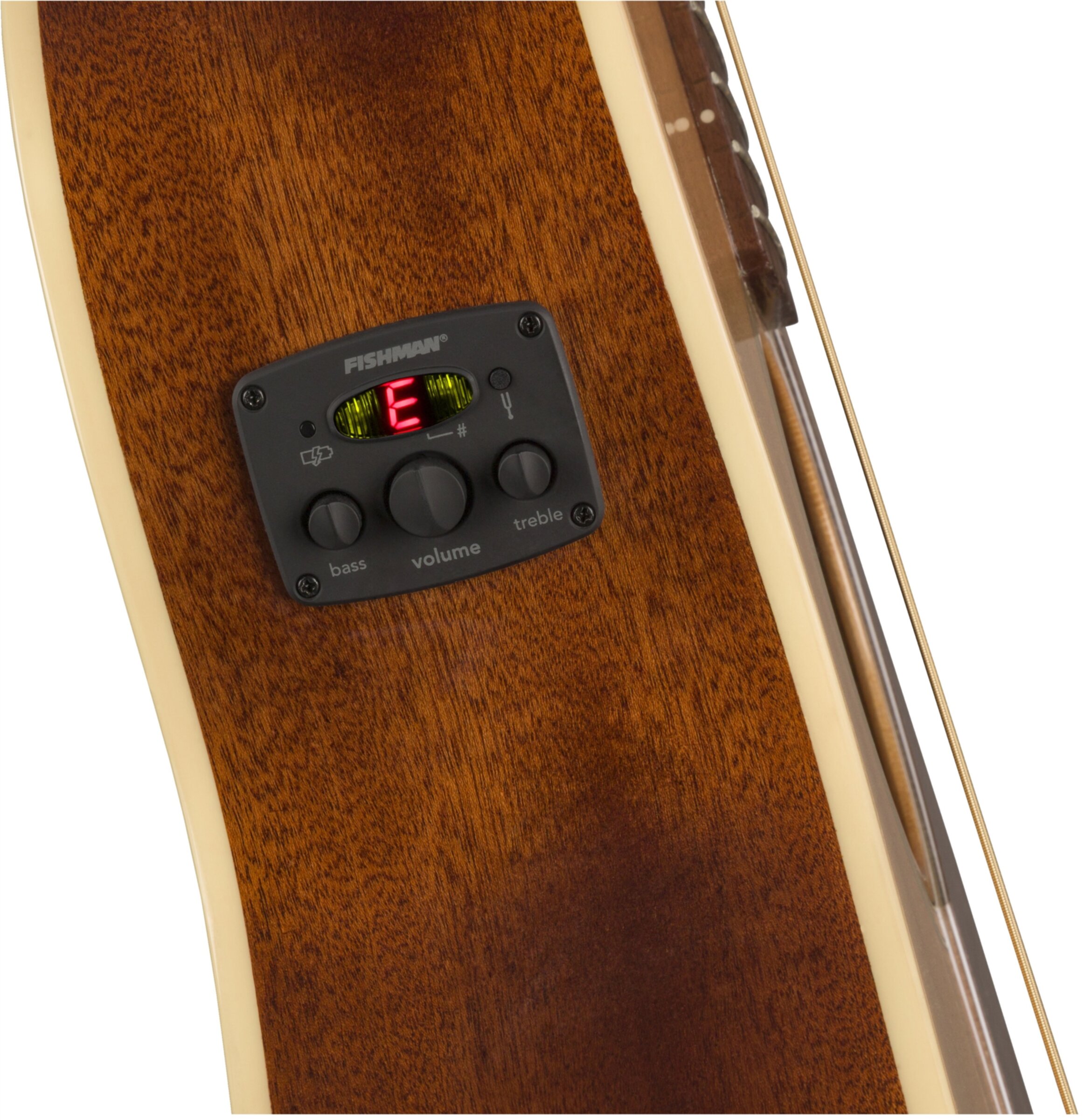 Série California Pan coupé Table en épicéa de Sitka massif Fond et éclisses en acajou Manche en acajou Touche en noyer Rayon de la touche: 400 mm 20 frettes Largeur au sillet: 43 mm Diapason: 650 mm Chevalet "Modern Viking" Système de micro Fender/Fishman Cordes Fender Dura-Tone .012 - .052 (254209) Couleur: Natural