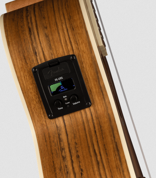 Baptisé du nom de l’un des plus célèbres spots de surf du sud de la Californie, le modèle Rincon de Fender produit un son riche et profond, et affiche un style unique. Entièrement fabriqué en ovangkol, ce ukulélé ténor offre une résonance et un volume accrus, avec un son plein, brillant et très musical. Le Rincon est équipé d’une électronique Fender®-Designed, pour les musiciens(nes) qui veulent transporter leur musique de la plage à la scène. L’instrument présente également un chevalet « no-tie » facilitant le changement des cordes, ainsi que des sillets de tête et de chevalet en os qui produisent une intonation supérieure. Une finition satinée à pores apparents, une rosace en abalone, des mécaniques fermées de style vintage et une tête de manche de Strat® avec 4 mécaniques en ligne complètent le look indéniablement classique de Fender.