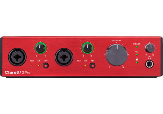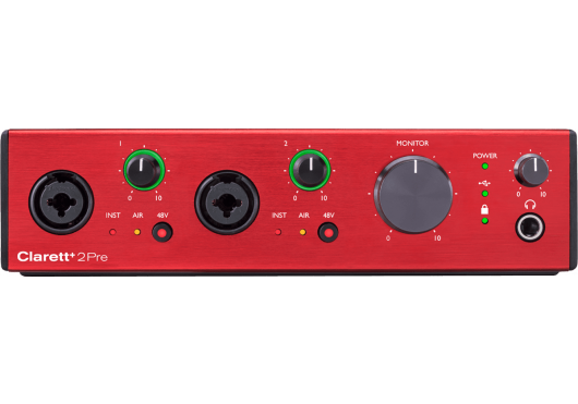 Deux préamplis micro Clarett + — équipés de la fonction Air tout en analogique avec commutation d’impédance et contrôle par relais — permettent d’effectuer des enregistrements d’une clarté exceptionnelle avec une grande quantité de Headroom, une faible distorsion et un niveau de bruit ultra-bas. Les deux entrées instrument JFET vous permettent de vous brancher directement et de préserver le son naturel de votre guitare, comme si vous la branchiez à un ampli.