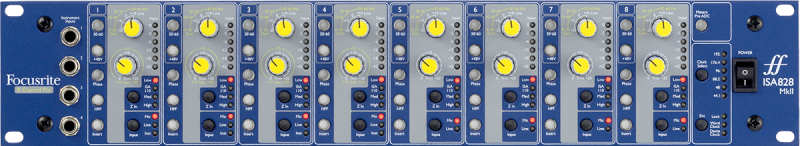 Partageant le design du célèbre module de préamplification micro Focusrite ISA 110 original, issue de la console "Studio", l'ISA 828 MkII intègre huit des préamplis micro classiques de Focusrite. Doté d'un transformateur Lundahl LL1538 sur chaque entrée, chaque canal a l'option d'entrée micro ou ligne, tandis que les entrées 1-4 disposent également d'un jack instrument sur le panneau avant. Chaque préampli micro bénéficie d'une impédance d'entrée variable, pour fournir une gamme d'options sonores lors de l'utilisation de microphones, avec même un réglage «ISA 110», qui reproduit l'impédance du préampli micro Focusrite d'origine.