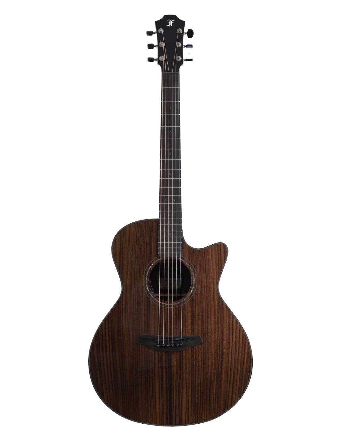 • Construction 100% palissandre foncé massif : table, dos et éclisses pour une réponse riche, dense et très expressive.