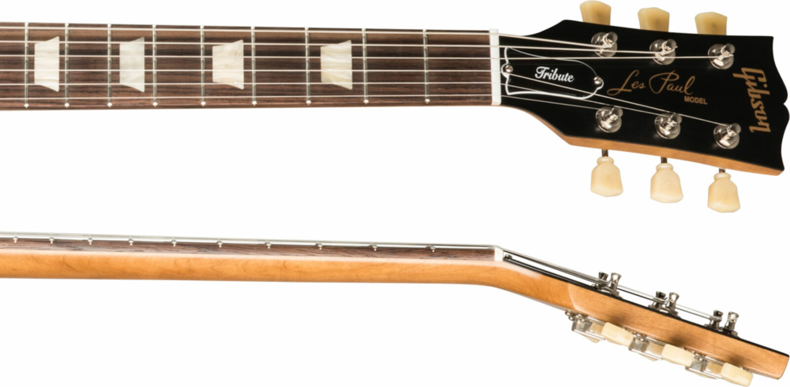 - GIBSON Modern Collection Les Paul Tribute 2019 - SKU Gibson LPTR00WONH1 - Guitare électrique solid body - Fabriquée aux USA - Corps en Acajou massif (ultra modern weight relief) - Table en Erable - Manche collé en Erable massif, profil Rounded - Touche Palissandre massif, 22-frettes médium-jumbo - Diapason 62.865 cm / 24.75" - Radius 12" - Largeur manche 1e frette 4.3053cm / 1.695" - Largeur manche fin de touche 5.7404cm / 2.260" - Sillet Graptech - Angle de tête 17° - Micros double-bobinage Gibson 490R Alnico II (manche), & 490T Alnico II (chevalet) humbucking pickups - Volume par micro - Tonalité par micro - Sélecteur micros 3-positions - Chevalet Aluminum Nashville Tune-O-Matic & cordier Aluminum Stopbar - Mécaniques bain d'huile Grover Rotomatic Keystone tuners, ratio 14:01 - Finition nitrocellulose, satin - Livrée en housse Gibson - Tirants de cordes recommandés 10.46