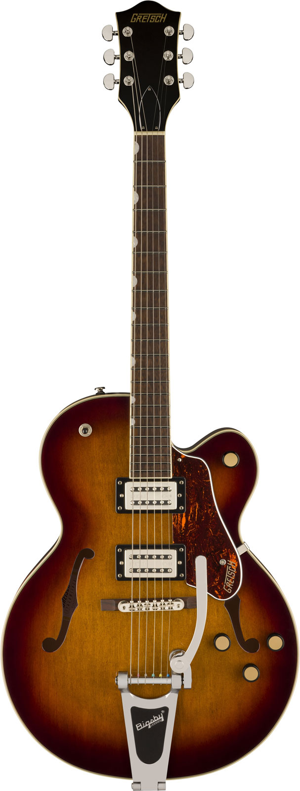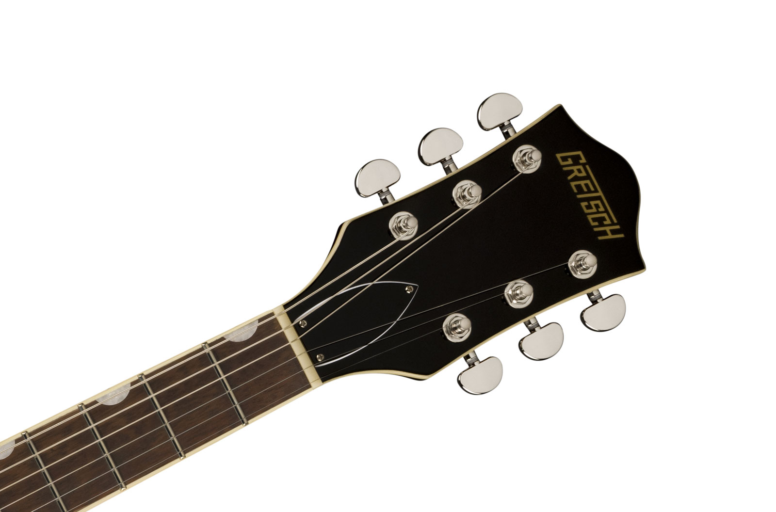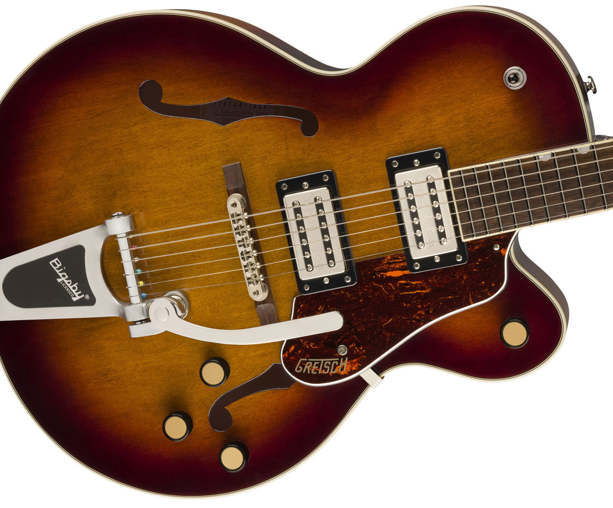 La G2420T Streamliner Hollow Body Single-Cut avec Bigsby® est dotée d'un corps en érable arqué entièrement creux avec des barres de tonalité parallèles pour une plénitude riche, une résonance profonde et un "son de grande caisse".