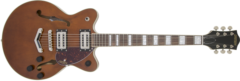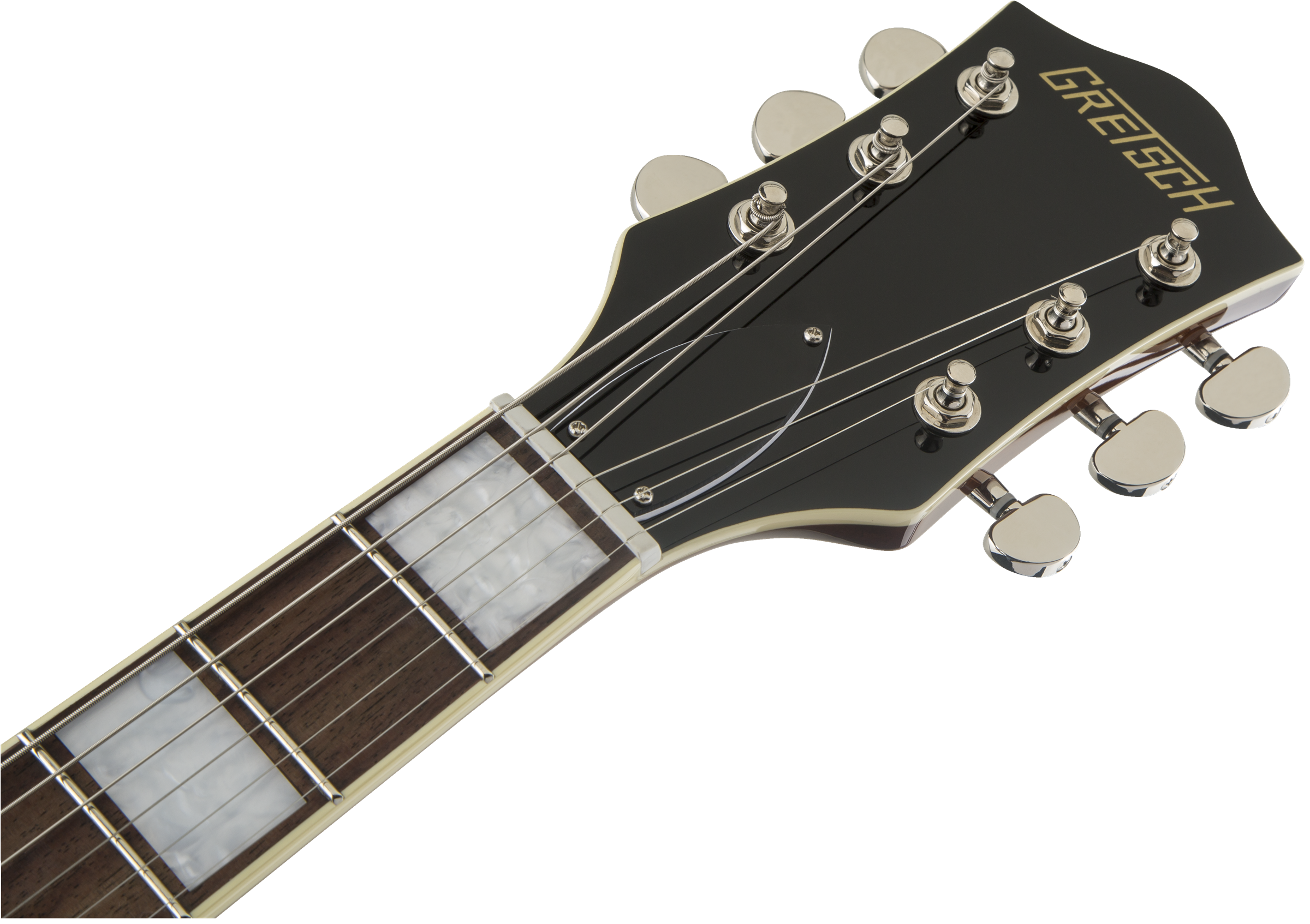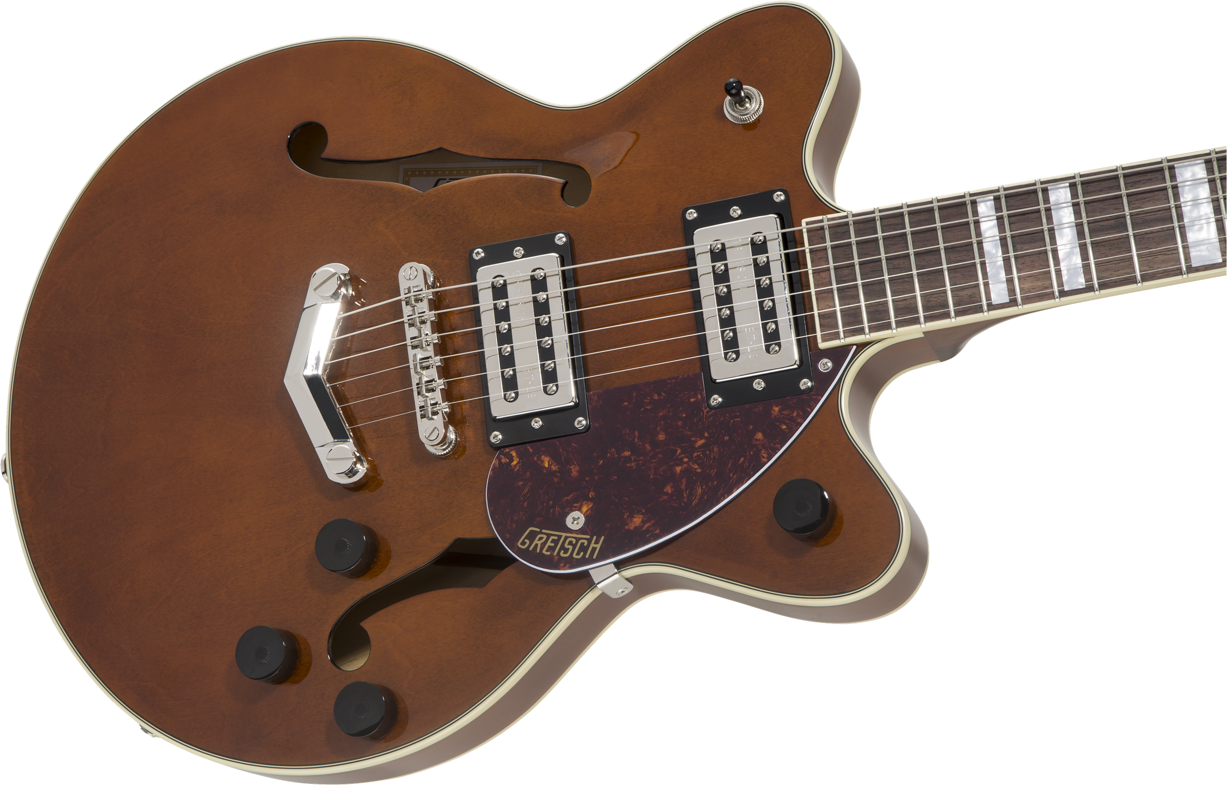 MODELE 2806500593 Semi-Hollow Double pan coupé Bloc central Corps en érable laminé Largeur du corps: 340 mm (13,375") Manche en nato Touche en laurier Repères gros blocs Pearloïd Filet de touche Rayon de la touche: 305 mm (12") Largeur au sillet: 42,90 mm (1,6875") Diapason: 629 mm 22 frettes Medium 2 micros double bobinage Broad'Tron BT-2S 1 réglage de volume 1 réglage de tonalité 1 réglage de volume général 1 réglage de tonalité général Cordier en V Chevalet ancré Adjusto-Matic