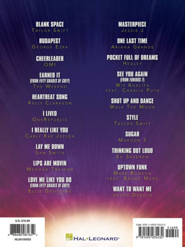 20 terrific tunes from today's top recording artists are included in this collection for piano, voice and guitar. Includes: Blank Space • Budapest • Cheerleader • Earned It (Fifty Shades of Grey) • Heartbeat Song • I Really like You • Lay Me Down • Lips Are Movin • Love Me like You Do • One Last Time • See You Again • Shut up and Dance • Sugar • Thinking Out Loud • Uptown Funk • Want to Want Me • and more. Instrumentation : Piano, Vocal and Guitar Édition musicale : Hal Leonard Collection : Piano/Vocal/Guitar Songbook Type de produit : Recueil Année d'édition : 2015 Nombre de pages : 128 Numéro d'edition : HL00150033