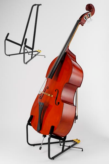 Support pliant pour contrebasse, le corps de l'instrument repose sur les pieds recouverts de mousse SFF, crochet pour archet (hauteur: 90 cm, poids: 3.4 kg, charge supportée: 50 kg, taille replié: 90 x 68.5 cm).