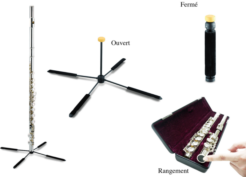 Support flûte traversière patte d'ut, repliable et ultra-compact, se range dans la patte de l'instrument (hauteur: 14.8 cm, poids: 0.1 kg, diamètre base: 16.5 cm, taille replié: 12.8 x 1.9 cm).