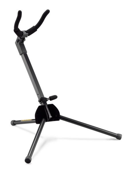 Support saxophone alto pliable ultra-compact, étrier ajustable, avec housse, se range dans le pavillon de l'instrument (hauteur: 29 cm, poids: 0.37 kg, diamètre base: 22 cm, taille replié: 27.5 x 7.5 cm).