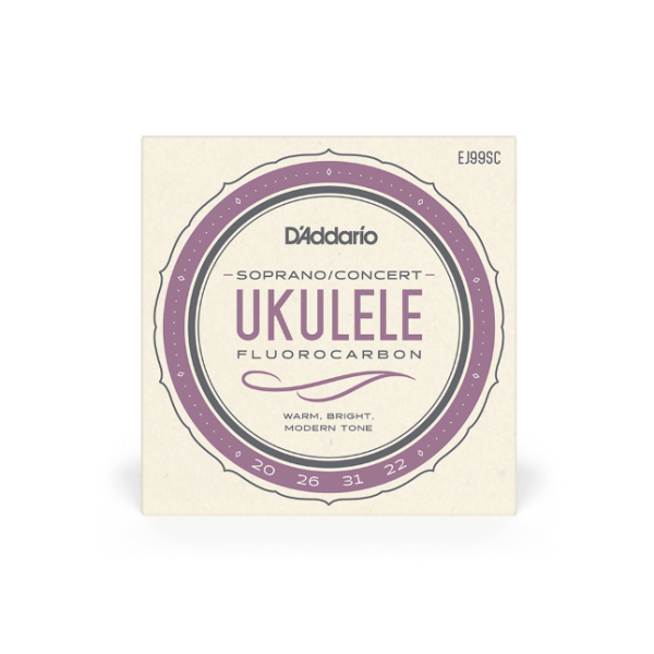 Le jeu pour ukulélé soprano / de concert EJ99SC est constitué de cordes exclusives Pro-Arté Carbon conçues conformément aux spécifications rigoureuses des cordes en nylon D’Addario. Ce jeu de cordes au fluorocarbone est optimisé pour une utilisation avec un accordage sol - do - mi - la (GCEA).
