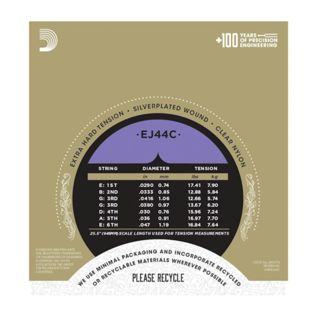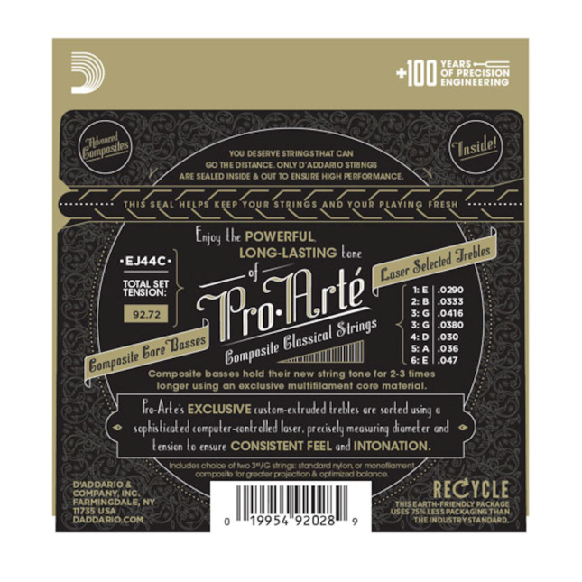 Le jeu EJ44C à tension extra-forte est idéal pour une résistance et projection maximales sans compromis sur le son.Les cordes Pro-Arte composites sont dotées d'un coeur exclusif multi-filaments qui délivre un son puissant mais chaud, avec une durabilité deux à trois fois supérieure à celle de cordes classiques traditionnelles. En plus des trois cordes aiguës traditionnelles en nylon, chaque jeu contient une troisième corde (Si) en option à mono-filament composite qui permet d'obtenir une meilleure projection et un équilibre optimal entre graves et aigus. Toutes les cordes aiguës Pro-Arte sont triées par une machine laser à commande numérique qui effectue des mesures de diamètre/tension afin de garantir un son authentique et des aigus précis pour chaque jeu.