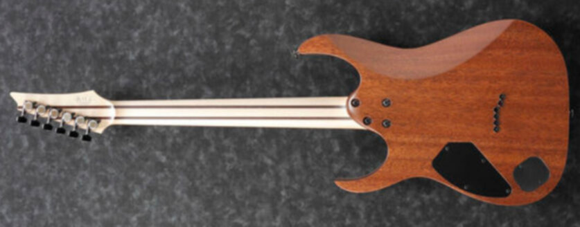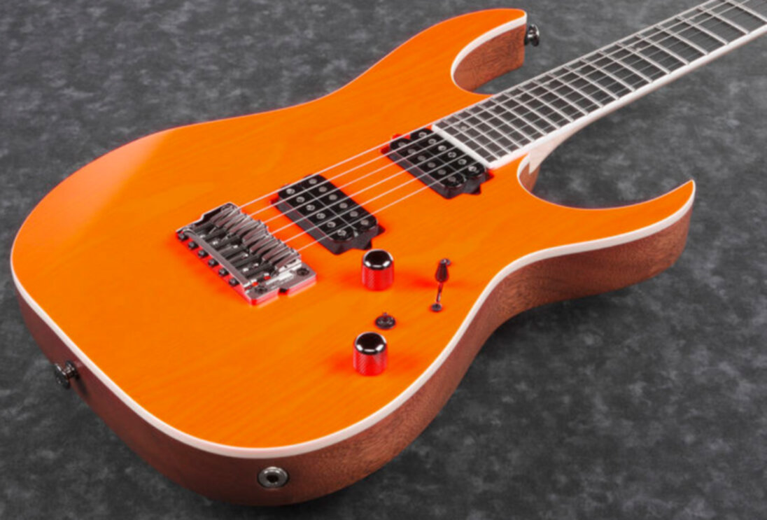 - Couleur : orange - Guitare électrique solid body - RG Series - Fabriquée au Japon - Corps Acajou - Table Frêne - Manche vissé, 5 pièces Erable/Wenge, profil Super Wizard HP - Touche Ebène Macassar, 24 frettes jumbo - Diapason 648mm/25.5" - Radius 430 mmR - Largeur de manche 1e frette 43 mm - Largeur de manche dernière frette 58 mm - Epaisseur manche 1e frette 17 mm - Epaisseur manche 12e frette 19 mm - Configuration micros HH Bare Knuckle Brute Force (passifs, aimants céramique) - Contrôles : voir schéma - Chevalet fixe Ibanez Gibraltar Standard II - Mécaniques bain d'huile à blocage Gotoh® MG-T locking - Livrée en étui Ibanez