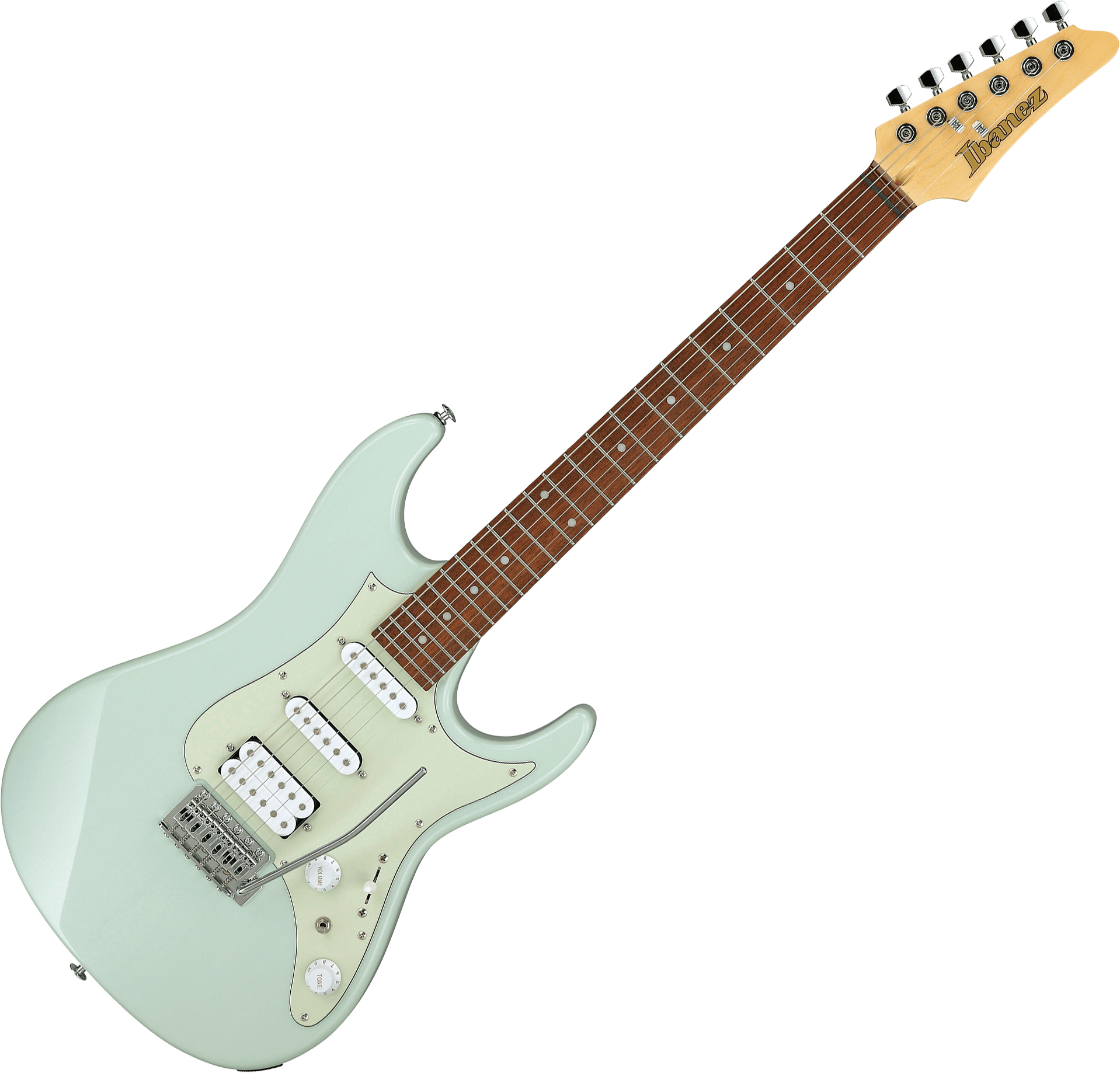 - Guitare électrique solid body - 2021 - Corps Peuplier - Manche vissé érable, profil AZES - Touche Jatoba, 22x frettes type médium - Diapason 648mm/25.5" - Rayon de touche / radius 250 mmR - Largeur manche 1e frette 42 mm - Largeur manche dernière frette 56.4 mm - Epaisseur manche 1e frette 20.5 mm - Epaisseur manche 12e frette 22.5 mm - Configuration micros HSS Essentials (passifs, aimants céramique) - Ibanez Dyna-MIX9 switching system w/Alter Switch - Vibrato traditionnel Ibanez T106 - Mécaniques Ibanez bain d'huile - Finition Mint Green