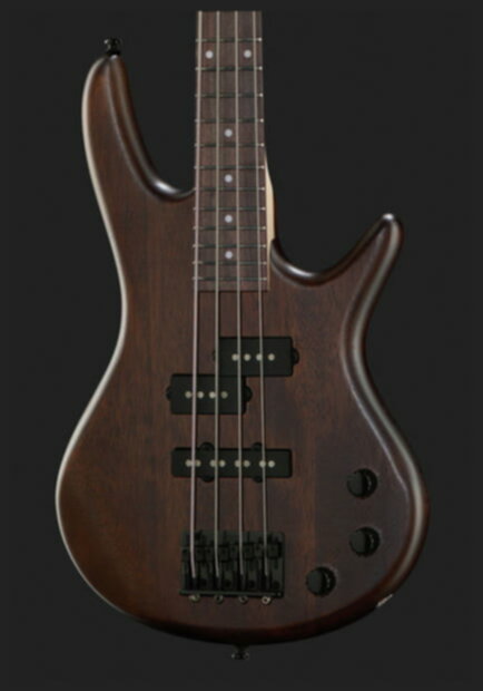 - 4 cordes- Corps en acajou- Manche en érable GSRM4 - 22 frettes Médium- Touche palissandre - Diapason: 726 mm (Short Scale) - Micro Dynamix style P/J Chevalet B10 - Accastillage chromé - Couleur: Walnut Flat