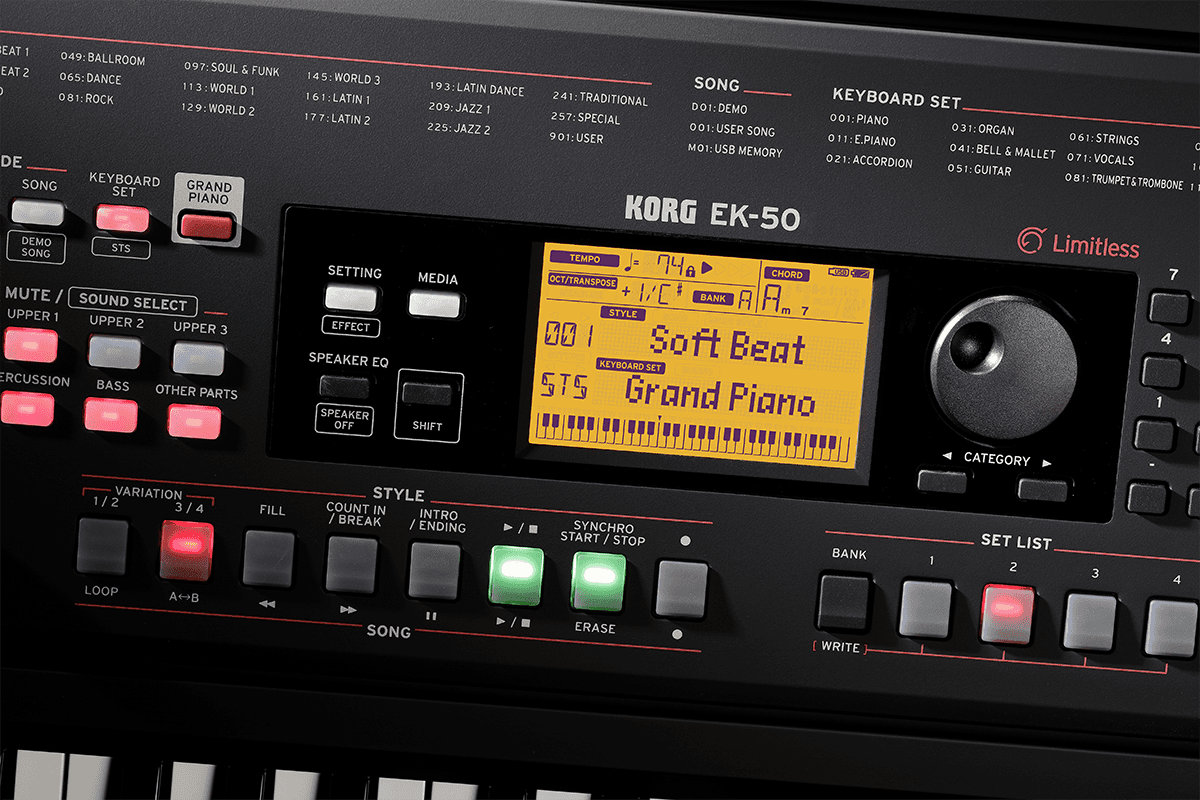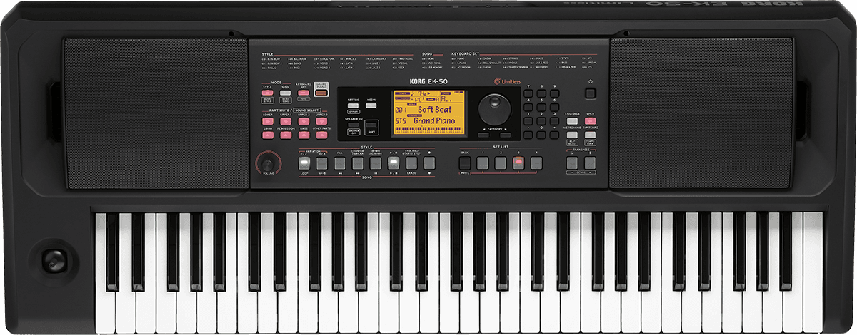 EK-50, l'arrangeur populaire et accessible de KORG permettant de jouer tout ce qui est possible avec accompagnement automatique, est maintenant disponible dans un modèle spécialisé. Il est équipé de haut-parleurs de haute puissance afin de répondre aux besoins d'une prestation dans un café-concert ou d'un petit événement, seul, sans avoir recours à un système de sonorisation. Mêmes caractéristiques que l'EK 50 sauf : Sons : 790 sons, 59 kits de batterie (y compris les kits de sonorisation compatibles avec GM) Ensembles de claviers : 200 Styles : 290 préréglages Titres de démonstration : 19 chansons Amplification : 10 W x 2 Haut-parleur : 120 mm Double dôme x 2 (Système de boîte bass-reflex) Dynamique du haut-parleur (SPL) : 94dB (1W, 1m) : Deux fois la sensation de volume de l'EK-50. Poids : 8 kg (sans repose-bande et piles) Modèle spécial avec un nouveau système de haut-parleurs puissant Sons de Dance Music et styles modernes Lecture de chansons (midifile/MP3) tout en jouant sur le clavier 61 touches sensibles à la vélocité Elements de contrôle rétro-éclairés 790 sons, 59 kits de batteries (y compris les sets de sons compatibles GM) 290 styles 19 morceaux de démonstration de différents genres Système de haut-parleurs: 2 x 10 Watt 2 haut-parleurs à double cône de 120 mm (système bass reflex) Polyphonie 64 voix Joystick 4 directions Entrée pour pédale contrôleur sur Jack 6,3 mm Entrée audio sur mini Jack stéréo 3,5 mm Sorties L/R sur Jack 6,3 mm Sortie casque sur mini Jack stéréo 3,5 mm USB to Host USB to Device Fonctionnement sur batterie possible Enregistreur de chanson Dimensions sans pupitre: 994 x 392 x 132 mm Poids: 8 kg