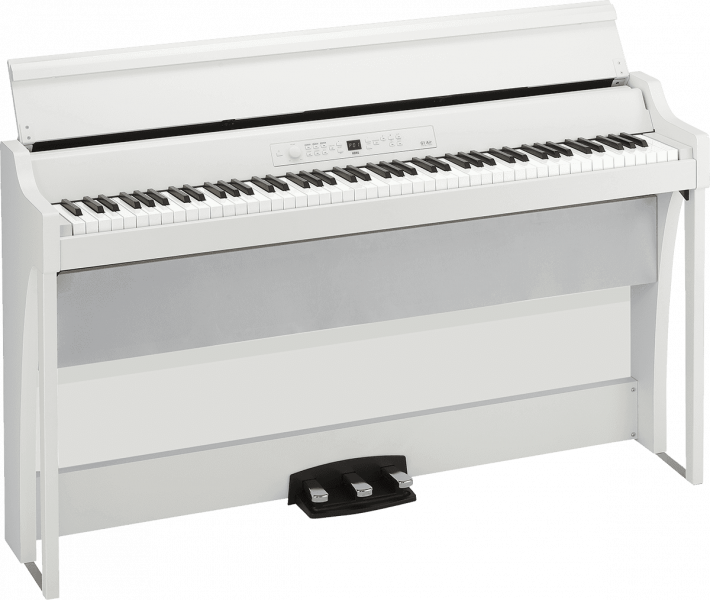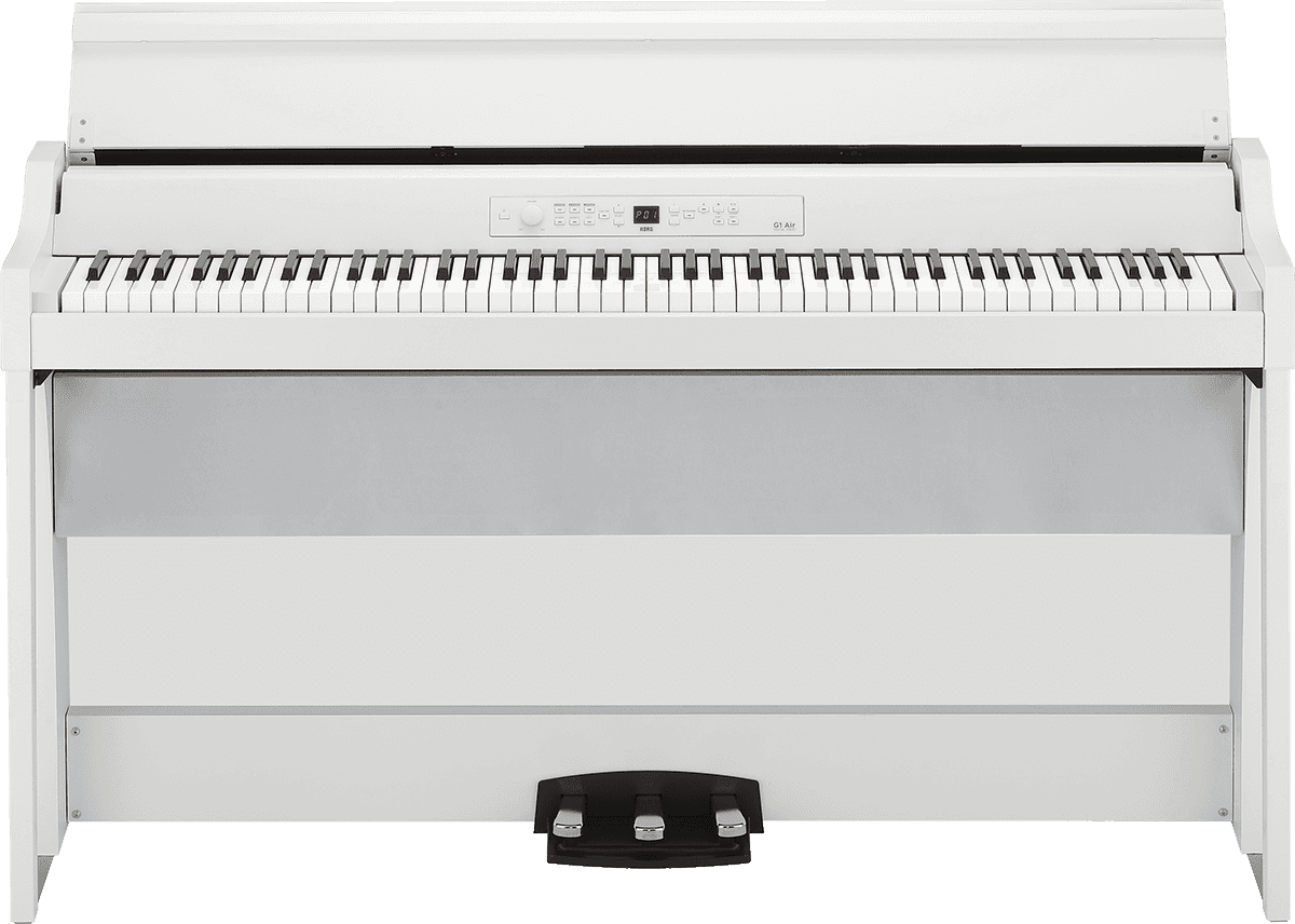 Le Korg G1 Air révolutionne l’univers des pianos numériques en intégrant pour la première fois les sonorités de pianos acoustiques issues du Kronos2. En proposant un son inégalé et une expérience de jeu parfaite, la firme nippone définit ici un nouveau standard pour le piano numérique. Au c�"ur du Korg G1 Air, 3 pianos de concert de renommée mondiale, chacun disposant de ses propres caractéristiques sonores. Vous pourrez expérimenter le son de ces 3 pianos et sélectionner celui qui convient le mieux à votre style. De plus, le G1 Air propose des sonorisations de pianos classiques, un orgue, un clavinet, un vibraphone, une guitare acoustique, des cordes et bien plus encore, jusqu'à 32 sons différents. Trois effets de haute qualité sont également disponibles : brillance, réverbération et chorus ainsi que le Bluetooth audio, transformant la colonne de haut-parleurs en enceinte Bluetooth de salon haut de gamme. Design sophistiqué et élégant, avec un panneau arrière complet. Ce panneau arrière renforce la qualité et la rigidité globale du meuble. - Clavier : RH3 �" 88 notes (5 niveaux de vélocité) - Générateurs sonores : german piano (G. piano), austrian piano (A. piano), japanese piano (J. piano), pianos classiques, orgue, clavinet, vibraphone, guitare acoustique, cordes... - Polyphonie maximale : 120 voix - Effets : brillance + réverbération + chorus - Connectique : sortie ligne + Midi (entrée, sortie) + USB + casques x 2 + enceintes + pédale sustain, soft et sostenuto - Système de diffusion : 2 voies avec 4 enceintes - Puissance de sortie : 80 W - Support audio Bluetooth - Poids & dimensions (l x h x p) : 41 kg - 1346 x 822 x 384 mm Spécifications Dimensions, Largeur : 1346 mm, Hauteur : 822 mm, Profondeur : 384 mm Poids : 41 kg Clavier Touches : 88 Mécanisme Clavier : RH3 Hammer Action Sensation touches : pondérée progressivement Sensibilité : léger, normal, lourd, stable, fixe Sons Génération de son : PCM stéréo Sons : 29 Sons basses : 3 Effets : brillance, réverbe, chorus Niveaux d'effets : 3 Échantillons de son : 3 Couches sonores : 2 maximum Polyphonie maximum : 120 Hauteur : transpose, master tuning Effets sonores : relâchement de la touche, résonance des cordes, résonance de la pédale de soutien Fonctions Nombre de chansons : 40 Tempo : intégré Lecture : intégrée Bluetooth: intégré Sauvegarde composition utilisateur : 99 Enregistreur : 2 pistes Stockage maximale de note : 45 000 notes Commandes : mise sous tension, volume, G.Piano, A.Piano, J.Piano, favori, split, function, select, tempo, métronome, lecture/pause, stop, rec, part1, part2 Générales Couleur : blanc Puissance haut-parleur : 4 x 20 watts Couvercle : pliant Pédales : sourdine, douce, soutien Adaptateur secteur : DC24V, inclus
