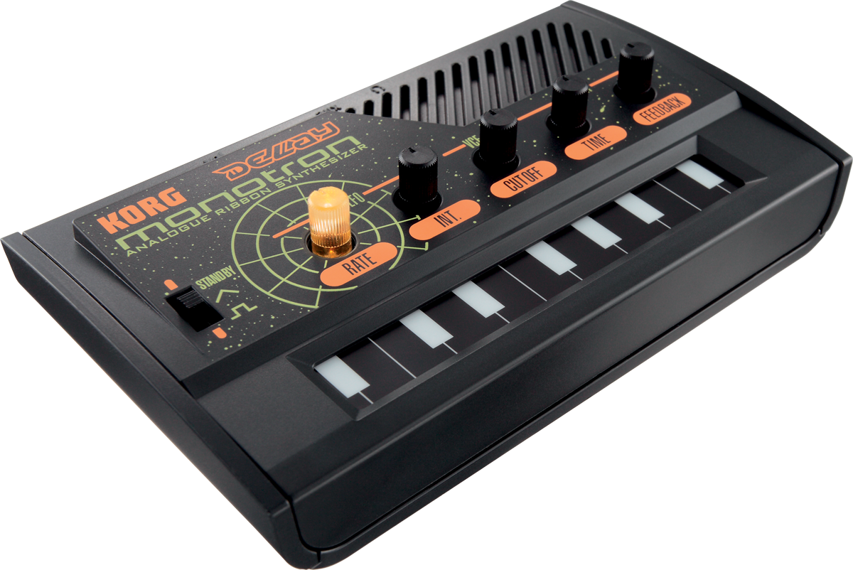 Synthétiseur miniature Le monotron est un mini-synthétiseur analogique avec un clavier à bande qui tient dans la main, équipé du fameux filtre qui a fait la réputation des MS-10 et MS-20.