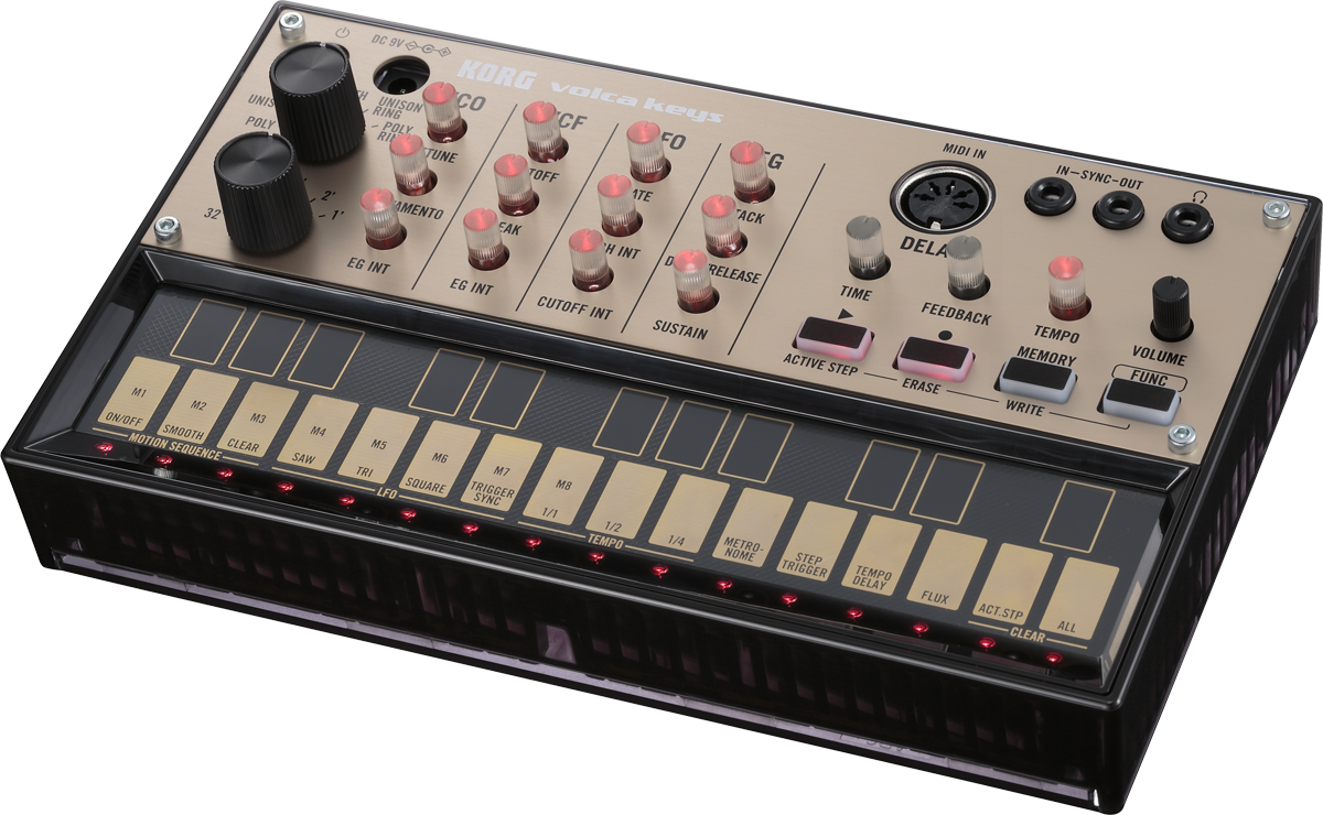 Volca est une série de 6 modèles analogiques, numériques, et de deux séquenceurs d'échantillons : - Le synthétiseur Volca Keys - Le synthétiseur de basse Volca Bass - La boîte à rythmes Volca Beats - Séquenceur d'échantillons Volca Sample et Volca OK-GO - Le synthétiseur Volca FM - Un générateur de sons de grosse caisse analogique Volca-Kick Chacun des modules comporte une synchro Midi pour s'interfacer avec son logiciel préféré et une sync in/out pour chaîner plusieurs Volca. Il s'emporte partout grâce à son fonctionnement sur batterie et à son mini haut-parleur. Le sync jack et le connecteur Midi in permettent l’exécution synchronisée avec plusieurs unités ou avec votre DAW. En utilisant le sync jack, vous pouvez profiter de la lecture synchronisée avec plusieurs Volca ou avec un Monotribe. Vous pouvez également utiliser l’application SyncKontrol (iPhone) pour contrôler sans fil le tap tempo, les paramètres de swing et la lecture synchronisée avec les applications de musique iOS via WIST. Le connecteur Midi in vous permet de synchroniser avec d’autres appareils ou de jouer le Volca à partir de n’importe quel clavier Midi. Vous pouvez également envoyer des messages de note de votre DAW et utiliser le Volca comme un module sonore analogique. Synthétiseur analogique avec 3 notes de polyphonie, ce qui est unique à ce niveau de prix. Le Volca Keys possède 27 touches, 3 oscillateurs, une section de filtre basée sur le miniKorg 700S, un délai, un séquenceur de boucles et un séquenceur de mouvements qui enregistre les éditions en temps réel. D'autres fonctions sont présentes, notamment Flux et Active step pour ajouter de la dynamique aux séquences. Comme les deux autres boîtes, il possède un séquenceur pas à pas très simple à utiliser. - Lead polyphonique - 27 touches - 3 oscillateurs - Filtre du légendaire MiniKorg 700S - Délai - Séquenceur de boucles - Séquenceur de mouvements - Flux et active step