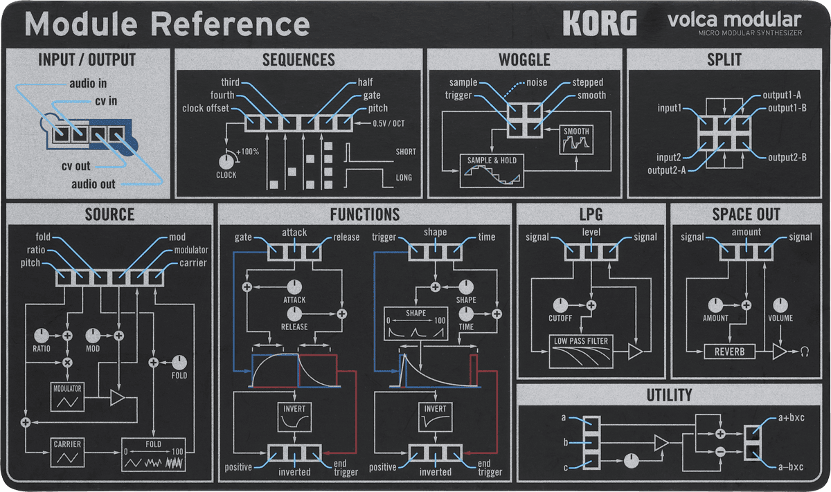Volca est une série de 8 modèles analogiques, numériques, et de deux séquenceurs d'échantillons : - Le synthétiseur Volca Modular - La boîte à rythmes Volca Drum - Le synthétiseur Volca Key - Le synthétiseur de basse Volca Bass - La boîte à rythmes Volca Beats - Séquenceur d'échantillons Volca Sample et Volca OK-GO - Le synthétiseur Volca FM - Un générateur de sons de grosse caisse analogique Volca-Kick Chacun des modules comporte une synchro Midi pour s'interfacer avec son logiciel préféré et une sync in/out pour chaîner plusieurs Volca. Il s'emporte partout grâce à son fonctionnement sur batterie et à son mini haut-parleur. Le sync jack et le connecteur Midi in permettent l’exécution synchronisée avec plusieurs unités ou avec votre DAW. En utilisant le sync jack, vous pouvez profiter de la lecture synchronisée avec plusieurs Volca ou avec un Monotribe. Vous pouvez également utiliser l’application SyncKontrol (iPhone) pour contrôler sans fil le tap tempo, les paramètres de swing et la lecture synchronisée avec les applications de musique iOS via WIST. Le connecteur Midi in vous permet de synchroniser avec d’autres appareils ou de jouer le Volca à partir de n’importe quel clavier Midi. Vous pouvez également envoyer des messages de note de votre DAW et utiliser le Volca comme un module sonore analogique. Chacun des modules comporte une synchro Midi pour s'interfacer avec son logiciel préféré et une sync in/out pour chaîner plusieurs Volca. Il s'emporte partout grâce à son fonctionnement sur batterie et à son mini haut-parleur. Le sync jack et le connecteur Midi in permettent l’exécution synchronisée avec plusieurs unités ou avec votre DAW. En utilisant le sync jack, vous pouvez profiter de la lecture synchronisée avec plusieurs Volca ou avec un Monotribe. Vous pouvez également utiliser l’application SyncKontrol (iPhone) pour contrôler sans fil le tap tempo, les paramètres de swing et la lecture synchronisée avec les applications de musique iOS via WIST. Le connecteur Midi in vous permet de synchroniser avec d’autres appareils ou de jouer le Volca à partir de n’importe quel clavier Midi. Vous pouvez également envoyer des messages de note de votre DAW et utiliser le Volca comme un module sonore analogique. L'inspiration du « West Coast style » dans un format Volca La synthèse « West Coast style » consiste à partir d’une onde pauvre en harmoniques (un sinusoïde par exemple) et lui ajouter de la modulation de fréquence et de la distorsion (ou wave shaping en anglais). En partant de l'analogique et en intégrant librement tous les éléments, y compris la FM et le PCM, la série volca se rapproche de la tendance "West Coast Style". Patcher pour dupliquer les possibilités Les modules du Volca Modular sont reliés entre eux par les câbles patchs fournis, permettant une large variété de combinaisons. Le châssis compact du Volca Modular offre 50 entrées et sorties de patch. Celles-ci sont codées par couleurs pour une reconnaissance visuelle simplifiée, et les signaux sont également marqués par des symboles pour indiquer l'audio, le control, le gate ou le trigger. En principe, chaque signal est connecté en fonction de son utilisation, mais sur le Volca Modular, les niveaux de signal sont universellement compatibles entre les modules, multipliant largement les possibilités de patchs. Vingt câbles patchs sont inclus, ainsi qu'une fiche de référence expliquant chaque point de raccordement et fournissant des exemples de raccordements standards.
