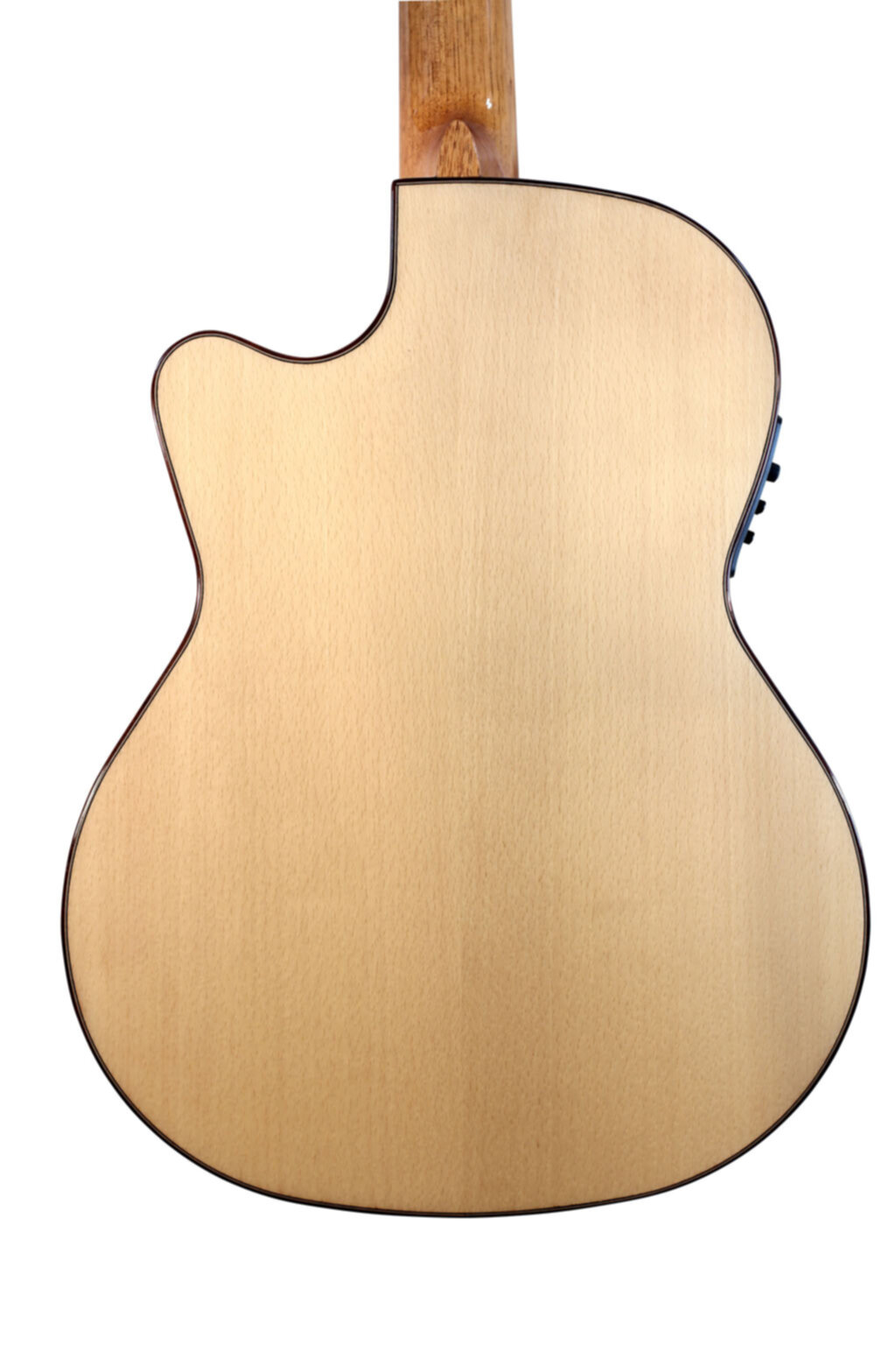 Cette nouvelle flamenca de toute beauté offre une excellente projection et une action de jeu croustillante, dûe en partie à une largeur de manche légèrement plus faible qu’une guitare classique traditionnelle puisque ce dernier mesure 50mm au sillet.