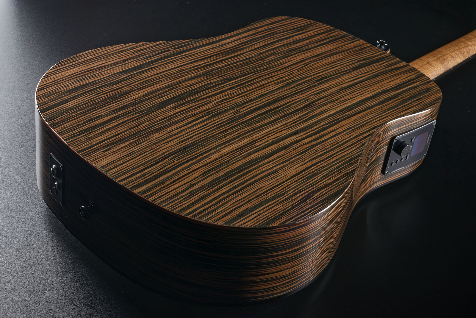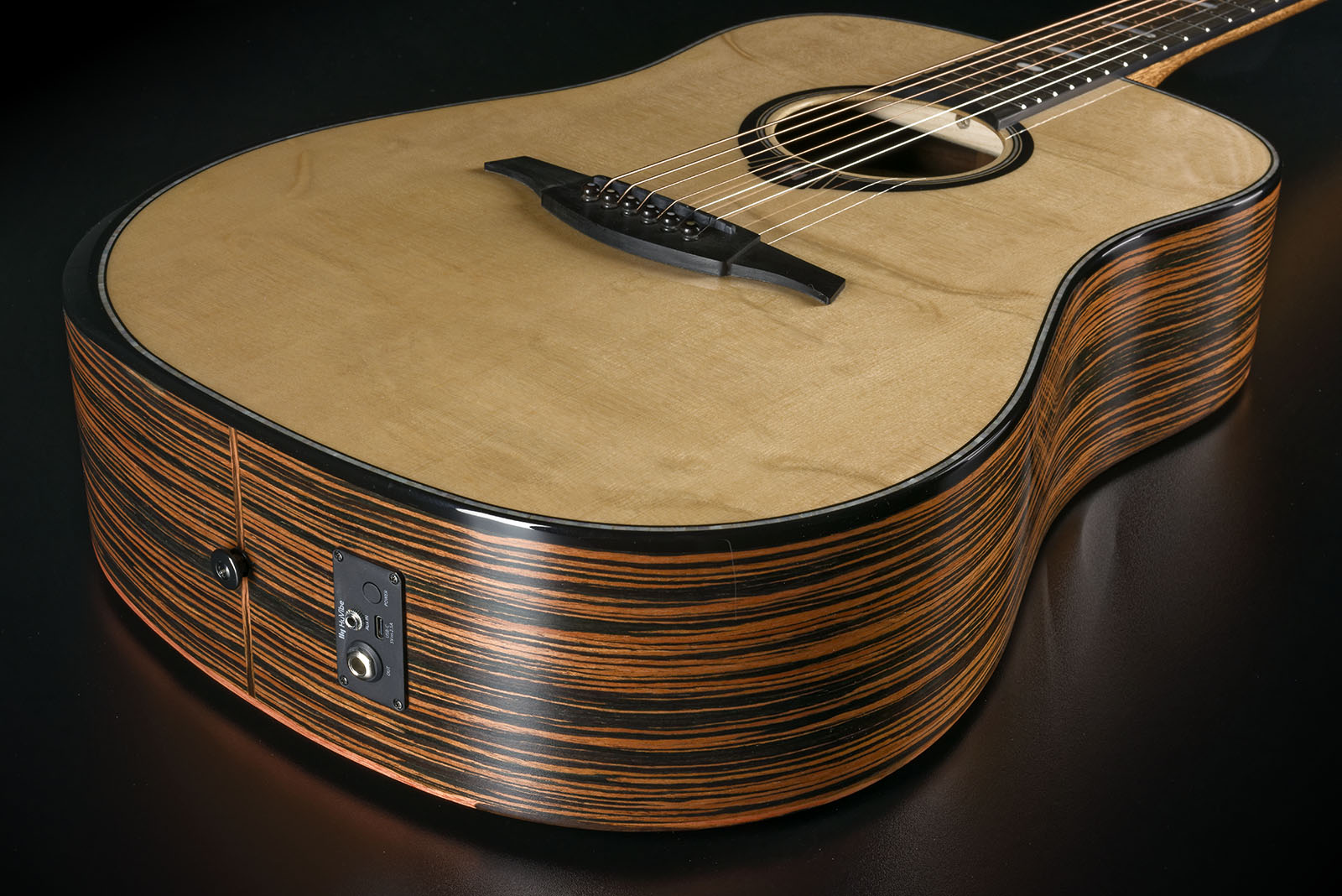 L’HV50DE met en avant la puissance et la projection du format dreadnought, sublimées par des bois premium et la technologie HyVibe. Sa table massive en épicéa Engelmann assure clarté et précision, tandis que le dos et les éclisses en ébène de Macassar offrent une esthétique luxueuse et une sonorité riche et profonde. Le bevel intégré apporte un confort de jeu remarquable, idéal pour les longues sessions. La finition brillante met en valeur les veinages spectaculaires du Macassar, et la touche ainsi que le chevalet en Brown Brankowood écoresponsable garantissent fluidité et durabilité. Avec le préampli HyVibe H2, profitez d’effets intégrés, d’un looper et de la connectivité moderne directement dans votre guitare.