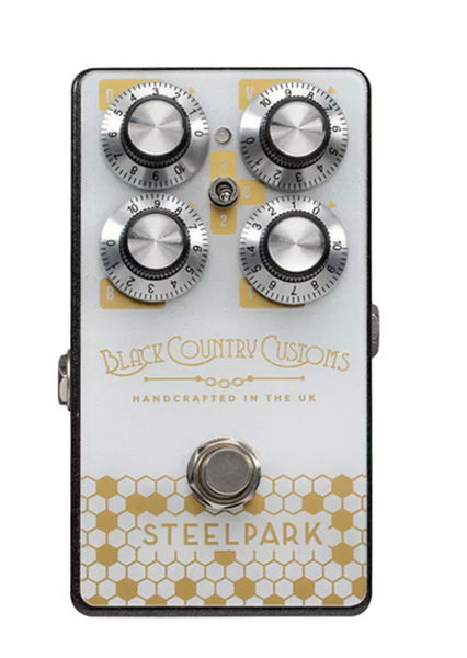 Pédale boost STEELPARK, 3 modes, jusqu'à 30dB de gain, switch silencieux, boitier métal, blanc et or
