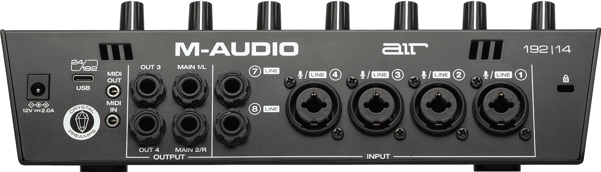 La Air 192X14 dispose de 4 entrées combo XLR/Jack 6,35 mm et de 2 entrées ligne jack 6,35 mm, complétées par 2 entrées instrument en jack 6,35 mm qui ont un étage de gain et d'impédance spécialement conçu pour fournir la restitution la plus précise du son de votre guitare ou basse lorsqu'elle est branchée directement sur l'interface. Pour compléter cette connectique déjà fort complète, la Air 192X14 est équipée d'une entrée et sortie MIDI au format minijack. Elle dispose d'une sortie stéréo pour moniteur de studio au format jack TRS 6,35 mm, et d'une sortie auxiliaire également en jack TRS 6,35 mm.