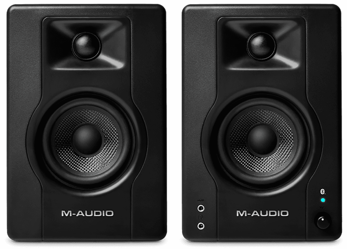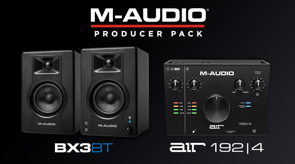 Pour écouter votre production avec un son fidèle et précis, ce Producer Pack est livré avec une paire d'enceintes BX3D4-BT de la marque. ces enceintes de monitoring compactes, héritières des célèbres BX5 et BX8 développées par M-Audio, offrent le nec plus ultra de la technologie actuelle à un tarif abordable. Son haut-parleur de 3,5" en Kevlar noir de qualité militaire et son tweeter de 1" à dôme de soie naturelle mettent à votre disposition 120 watts (en crête) d'un son cristallin, avec une image stéréo impressionnante. Sa conception bass-reflex, avec un évent arrière et un caisson en MDF acoustiquement neutre, assure une réponse étendue dans les basses fréquences et une réponse en fréquences sur l'ensemble du spectre. Les paramètres d’égalisation High et Low permettent d’ajuster idéalement le rendu sonore pour chaque environnement d’écoute, tandis que le commutateur de position du haut-parleur actif vous permet de régler librement son positionnement, entre la droite et la gauche. Enfin, ces enceintes de monitoring embarquent un module Bluetooth, vous permettant de diffuser de la musique directement à partir d'un appareil mobile.