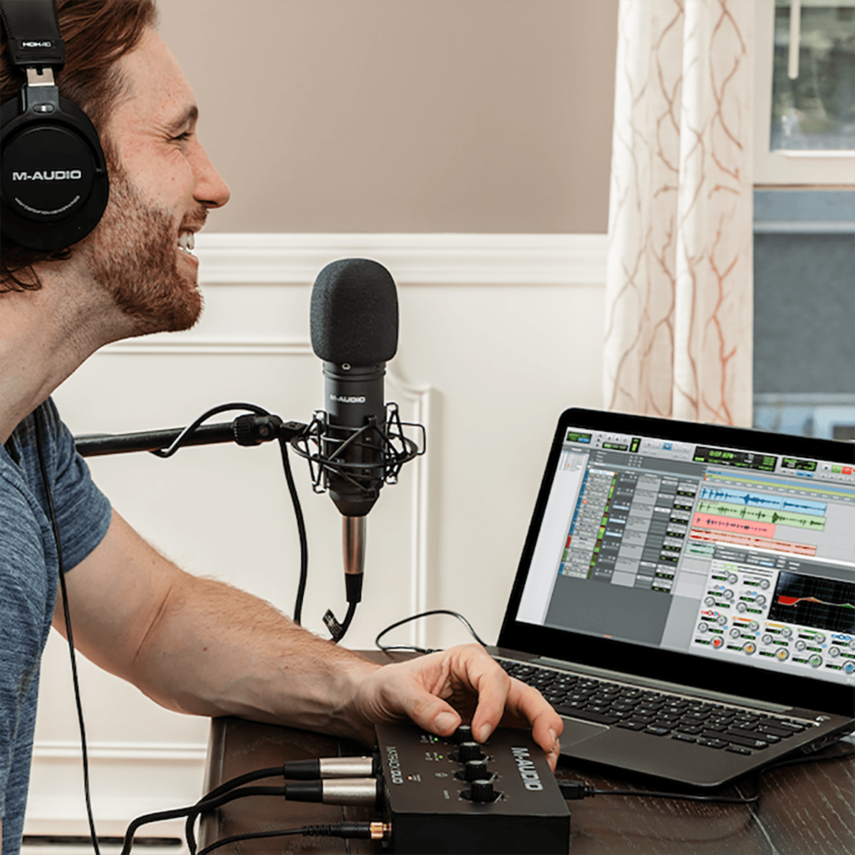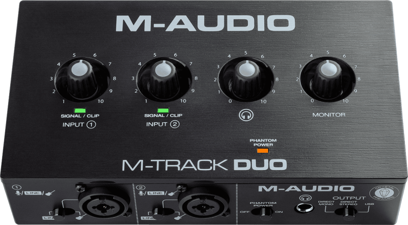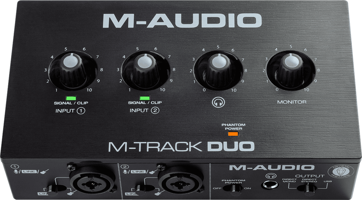 Un son pur dans un format réduit. La M-Track Duo est une interface audio des plus compactes, mesurant seulement 19 cm de large pour 11 cm de profondeur, et juste 5,5 cm de hauteur. Avec de telles mensurations, elle passerait presque inaperçu sur un bureau ! Mais sous ce petit gabarit se cachent deux péamplis Crystal très transparents développés par M-Audio, assurant le traitement du signal des deux entrées combo XLR/jack, assistés par des convertisseurs analogiques/numériques 24 bits/48 kHz pour un rendu des plus précis. Une interface pour tous les instruments. Les entrées combo dont disposent la M-Track Duo présentent l'énorme avantage d'offrir une polyvalence accrue, ne la limitant pas uniquement au branchement d'un seul type d'instrument. Combinant astucieusement une prise XLR et une prise jack, elle vous permet de brancher aussi bien un micro qu'une guitare ou une basse. De plus, le sélecteur de niveau vous permet de commuter les entrées au niveau ligne, afin de pouvoir brancher vos appareils favoris, que ce soit une boite à rythmes ou un piano numérique. Les deux entrées combo intègrent également un alimentation fantôme 48V, pour alimenter vos micros à condensateur. Un système de monitoring très complet. La M-Track Duo offre un système de monitoring des plus complets pour toutes les entrées disponibles, qu'elle soit micro, ligne ou instrument, via la sortie casque ou les sorties principales au format jack, et ce sans aucune latence. Le commutateur USB/Direct (mono ou stéréo) permet de sélectionner la source de la pré-écoute au casque et via les sorties principales, entre une pré-écoute de l'ordinateur (USB), une pré-écoute de toutes les entrées sommées en mono (Mono) et une pré-écoute de chaque entrée séparée entre la droite et la gauche (stéréo). Ce système simplifie grandement l'enregistrement de nouvelles parties, ou l'ajout de parties à une composition existante. Une avalanche de logiciels et de plugins. La M-Track Duo est livré avec un ensemble complet de logiciel, offrant tout ce qui est nécessaire pour réaliser immédiatement des enregistrements professionnels. Grâce aux deux puissants DAWs Pro Tools M-Audio First Edition et MPC Beats, cette interface vous offre tout ce dont vous avez besoin pour donner un rendu professionnel à vos chansons, podcasts ou streaming live. Elle intègre également une puissante suite de mixage comprenant 20 plugins, la collection d’effets AVID et deux puissants instruments virtuels : Eleven Lite pour les guitaristes, et Xpand !2, un synthétiseur très polyvalent au son étonnant. - Résolution max : 16-bits - Catégorie : interface audio - Format : desktop - Logiciels fournis : Xpand!2 Air Music Tech, Eleven Lite, Avid Effects Collection, MPC Beats, Pro Tools | First M-Audio Edition - Interfaçage : USB 2.0 - Alimentation : USB - Compatibilité : PC, Mac - Dimensions (mm) : 191 x 111 x 55 - Interface MIDI : Non - Wordclock : Non - Alimentation fantôme : Oui - Poids (kg) : 0,365 kg - Fréquence d'échantillonnage : 48 kHz - Nombre d'entrées : 2 - Nombre de sorties : 2 - Nombre entrées micro : 2 - Nombre entrées instrument : 2 - Nombre d'entrées analogiques : 2 - Specs complémentaires : - Interface audio USB 2 canaux, 2 entrées combo commutables niveau ligne/instrument, compatible Mac et PC - Entrées : 2 combo XLR/Jack commutables niveau ligne/instrument avec alimentation fantôme 48V pour les micros statiques. - Sorties : principale au format jack, casque au format jack. - Commutateur USB/Direct Mono/Direct Stereo : écoute du signal d’entrée provenant des deux canaux en stéréo (Direct Stereo), sommation mono (Direct Mono), ou du son provenant de l’ordinateur uniquement (USB). - Réponse en fréquence : 20 Hz - 20 kHz - Convertisseur analogique/numérique 48 kHz - Rapport signal/bruit : 109 dB - Taux de distorsion harmonique + bruit : 0,003% (à 0 dBu)