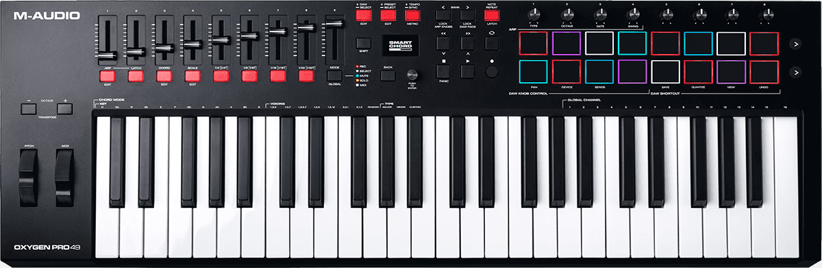 Au-delà de l'interface purement physique, l'Oxygen Pro 49 présente toute une série de fonctionnalités afin de booster votre créativité, tels que les modes Smart Chord et Smart Scale. Lorsque le Smart Chord est activé, une simple pression sur une touche ou un pad permet de jouer un accord complet, avec des options avancées de propriétés de l'accord et des progressions personnalisées sur le clavier. Avec Smart Scale, le clavier de l'Oxygen Pro 49 peut être paramétré pour jouer uniquement sur l'une des 16 variations de gamme : impossible de faire de fausses notes ! Ajoutons à cela que l'Oxygen Pro 49 dispose d'un clavier de dernière génération équipé d'une technologie de scan à haute fréquence offrant une expérience de jeu exceptionnelle. Il intègre également un aftertouch programmable idéal pour apporter de la dynamique et de l'émotion à votre jeu sur vos instruments virtuels, ainsi qu'un fonction de zones assignables pour assigner différentes parties du clavier à des sons différents.