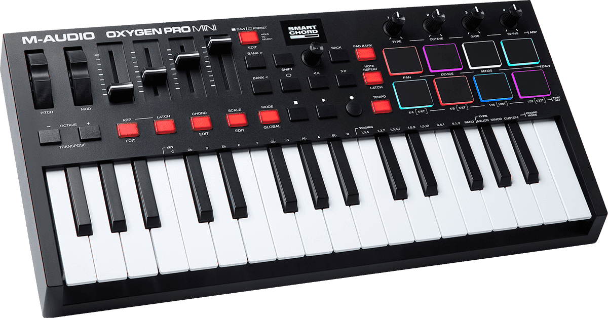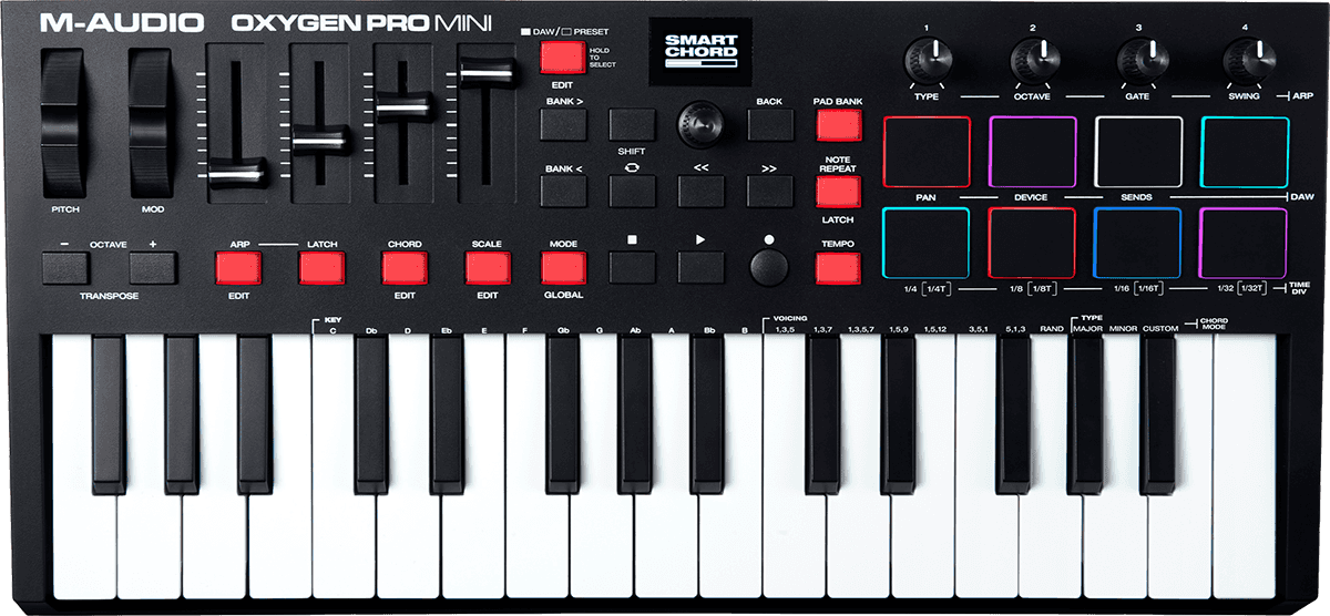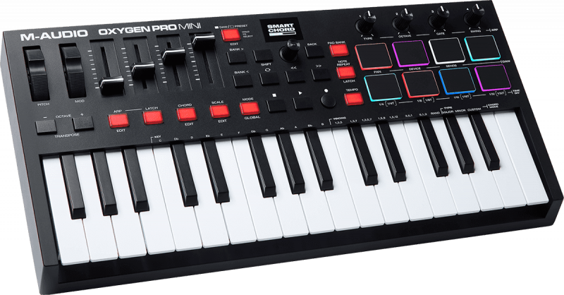 Au-delà de l'interface purement physique, l'Oxygen Pro Mini présente toute une série de fonctionnalités afin de booster votre créativité, tels que les modes Smart Chord et Smart Scale. Lorsque le Smart Chord est activé, une simple pression sur une touche ou un pad permet de jouer un accord complet, avec des options avancées de propriétés de l'accord et des progressions personnalisées sur le clavier. Avec Smart Scale, le clavier de l'Oxygen Pro Mini peut être paramétré pour jouer uniquement sur l'une des 16 variations de gamme : impossible de faire de fausses notes ! Le clavier de ce contrôleur est de plus équipé de la technologie PrecisionTouch de M-Audio, combinant une action professionnelle semi-lestée avec une technologie de balayage à haute vitesse avancée offrant une expressivité et une expérience de jeu sans équivalent.
