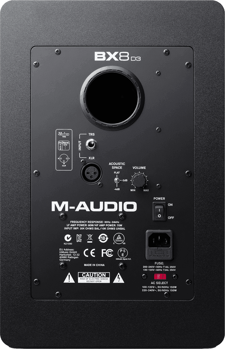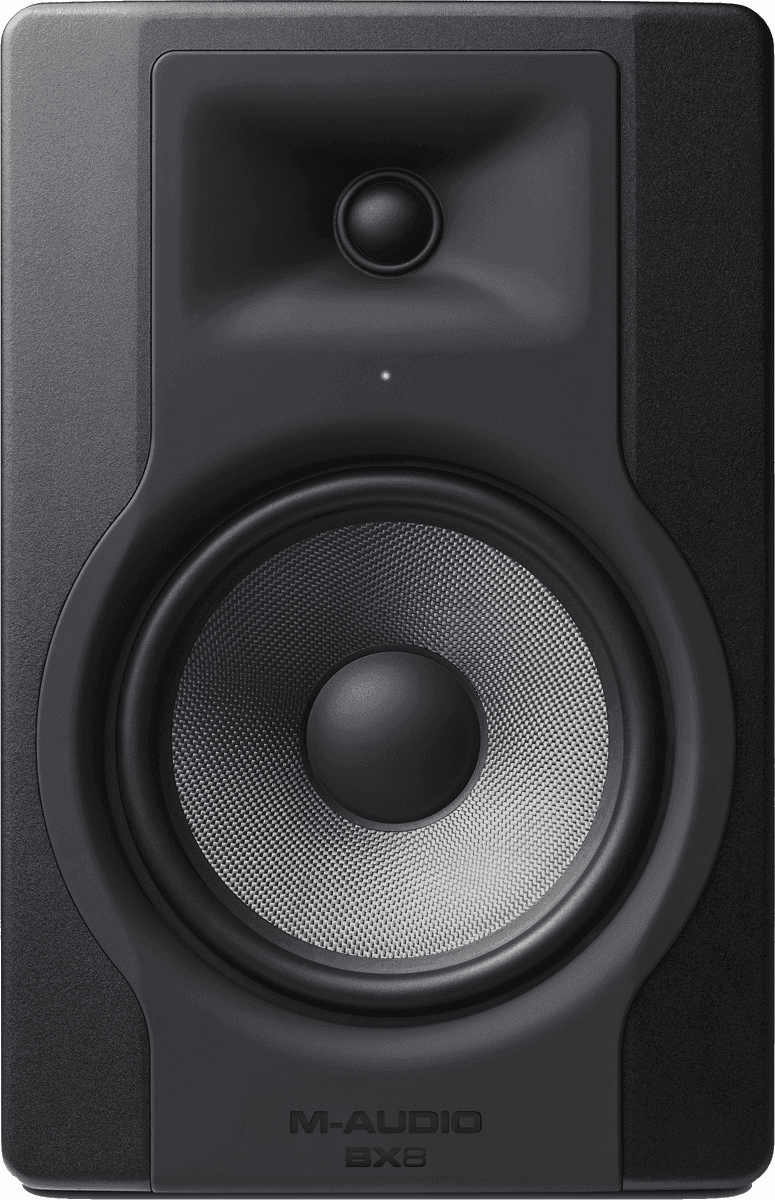 Pour les BX8-D3 de M-Audio, chaque détail a été méticuleusement examiné dans le but de faciliter un mixage précis en toute confiance. L'évent arrière, spécifiquement développé pour ces écoutes, minimise les turbulences de l'air et la distorsion tout en offrant une réponse encore plus étendue dans les basses. Le tweeter des BX8-D3 est monté dans un guide d'onde original pour une dispersion fiable et précise qui élimine les hautes fréquences indésirables, tout en assurant une image sonore d’une ampleur exceptionnelle. Au moment du monitoring, il est essentiel d'être assis à la position centrale entre les deux haut-parleurs, le « sweet spot », à l'emplacement précis où l'image stéréo est optimisée. Les BX8-D3 disposent d'un témoin qui simplifie la localisation de ce sweet spot. Placez les moniteurs de façon à ce que ces témoins vous paraissent les plus lumineux possible : vous êtes alors dans la position d'écoute idéale. Enfin, le design singulier de la façade, en forme de trou de serrure, ne se résume pas à son aspect esthétique : cette conception spéciale, sans attache, garantit qu’aucune tête de vis de fixation n’interfère avec le son des haut-parleurs.