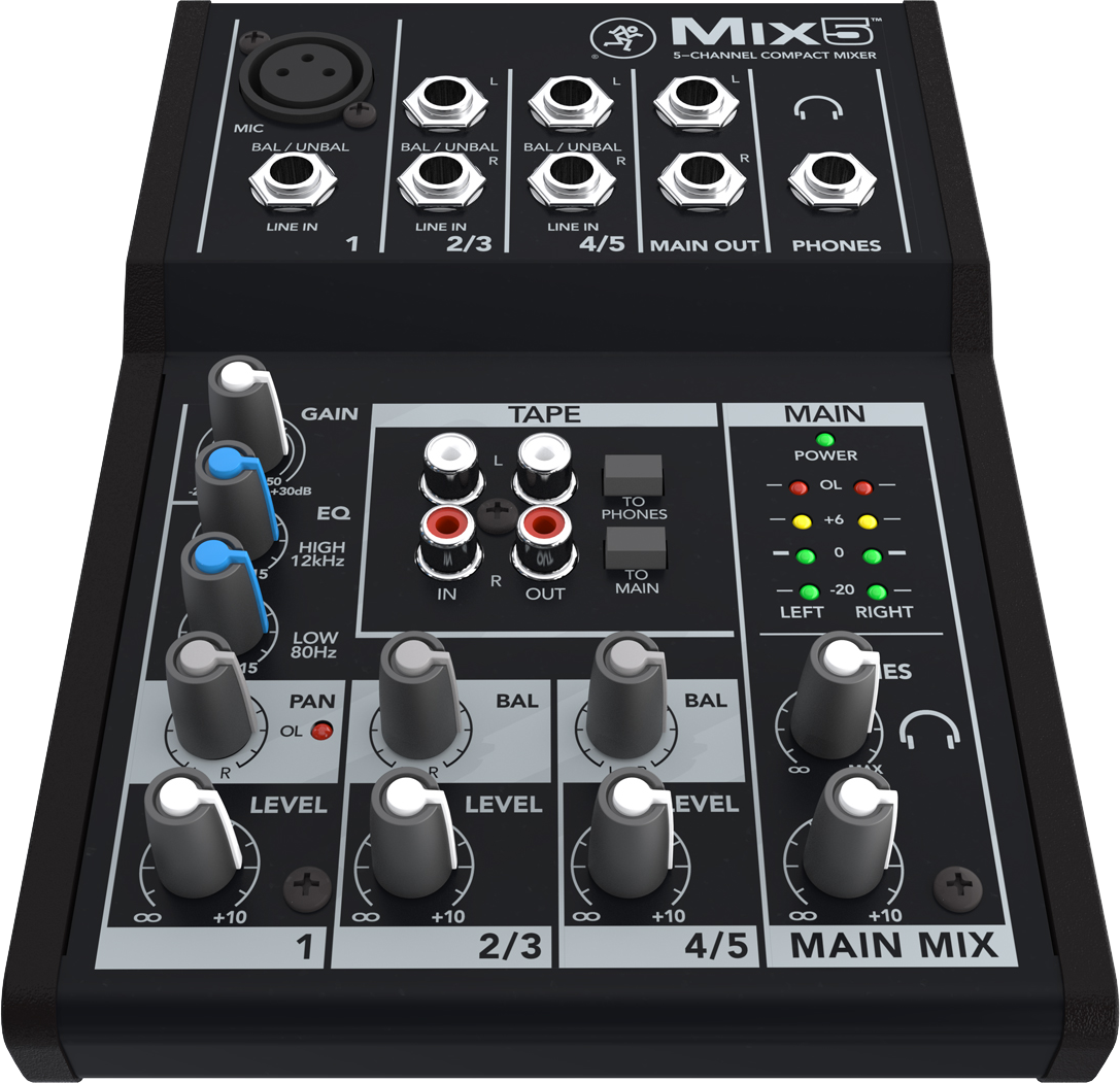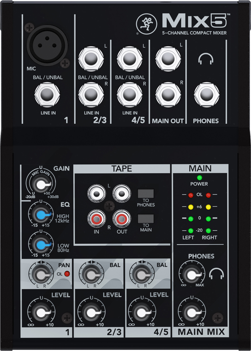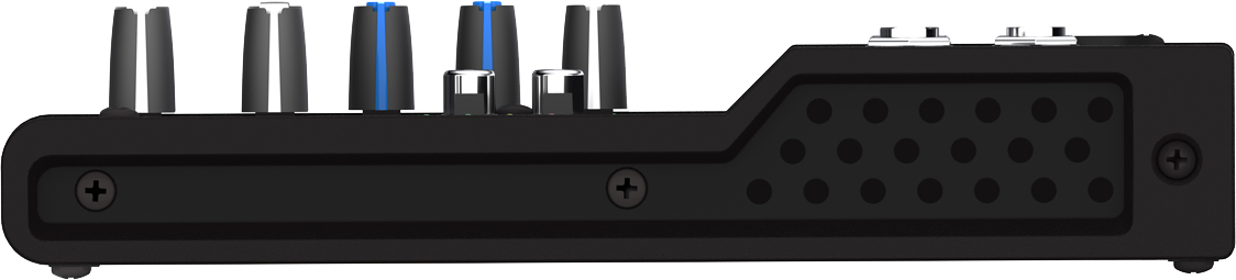 - 1 entrée mic/line XLR et jack 6,35 mm avec gain ajustable et Eq. 2 bandes - 2 entrées stéréo symétriques en jack 6,35 mm - Contrôle de volume et de panoramique par tranche - Entrées et sorties RCA dédiées à l'enregistrement et la lecture - Sorties Main L/R, 2 x jack 6,35 mm - 1 sortie casque 6,35 mm avec contrôle de volume indépendant - Poids et dimensions : 0,6 kg, 140 x 196 x 43 mm