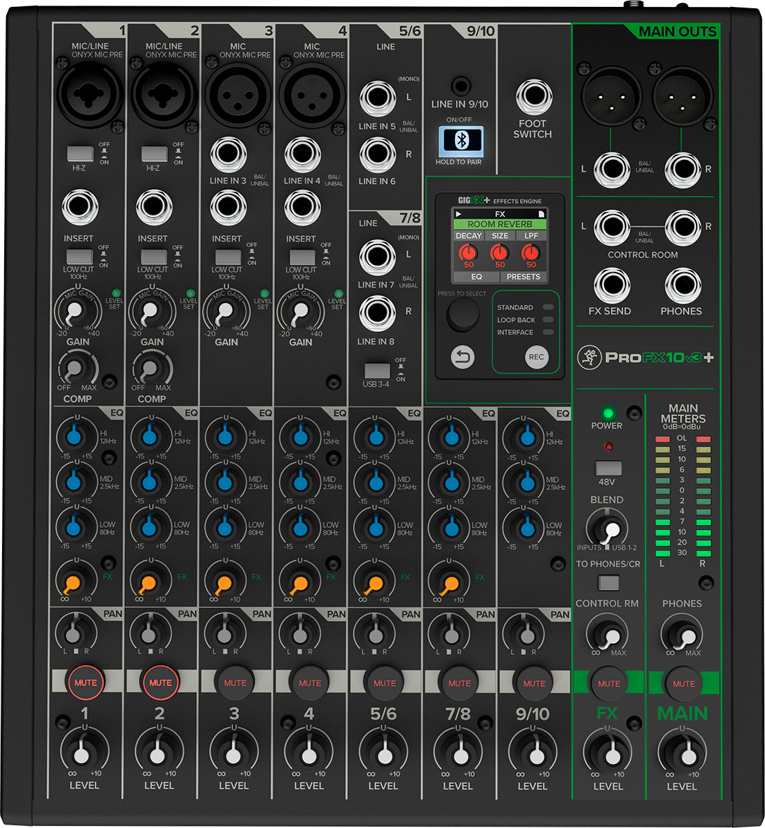 - 4 préamplis micro Onyx avec jusqu'à 60 dB de gain et fonctionnement à bruit ultra-faible