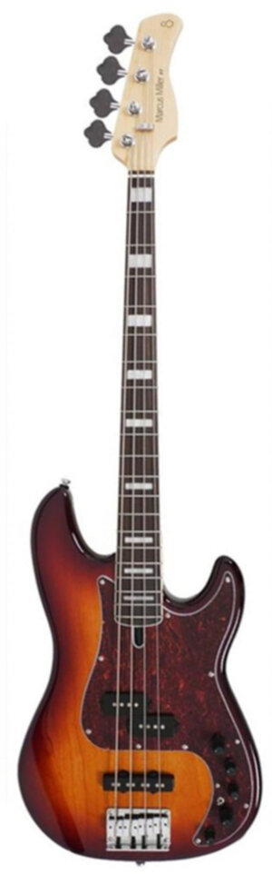 P7 Aulne 4 Tobacco sunburst. Forme Précision, corps en aulne, manche érable, touche palissandre. Le set de micros Marcus Super Precision est fabriqué aux états-unis avec réalisé avec une bobine Formvar. C'est un jeu de micros amélioré qui vous permet d'obtenir le timbre de la Precision bass et le son vintage d'une Jazz bass. Le préampli à 3 bandes de Sire a été développé pour la série des basses Marcus Miller afin de répondre aux besoins de la versatilité de Marcus Miller et couvrir differents styles de musique. Existe en 5 cordes CORPS Materiaux : Frêne des marais / Aulne nord américain + table érable massif + placage vernis Design : New Marcus Miller Jazz Type Couleurs : Ash Body NT, TBK | Alder- Body BRS Pickguard : None MANCHE Materiau : 1 pièce érable massif Forme : C-Shape Diapason : 34” Assemblage manche : 4 vis acier plaque manche TOUCHE Materiau : Ebène Radius : 7’25” Frettes : Medium Small, 20 Frettes Sillet : Os naturel Bone 38mm largeur (4 cordes), 45mm (5 cordes) Binding : 1 pli ivoire Inserts : WH Pearloid Block Electronique: Micros : Marcus Super Jazz set Preampli : Marcus Heritage- 3 avec contrôle de fréquence medium Contrôles : Volume / Tone (Dual Pot) | Pickup Blender | Treble | Middle / Middle Frequency (Dual Pot) | Bass, Mini Toggle (Actif / Passif ) Boutons : plastique noir Accastillage: Chevalet : Heavy Mass Standard Mécaniques : Sire Premium Open-Gear Hardware Finition : Chrome