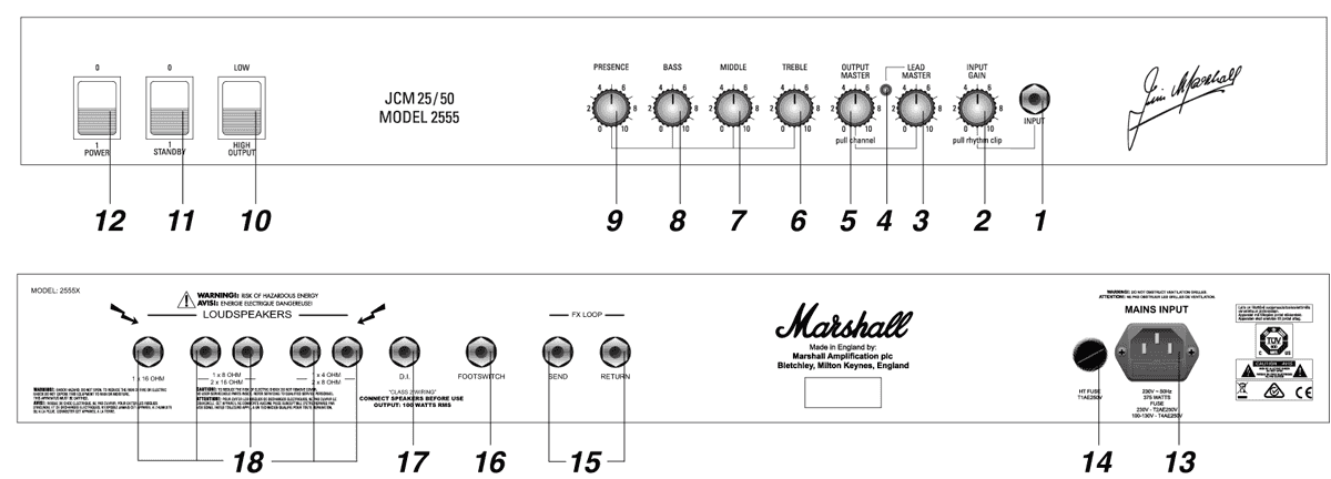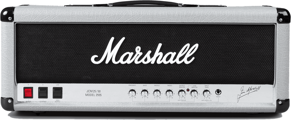 Basée sur les modèles JCM800 2203 et 2204, la 2555 fut l’une des premières productions Marshall à comporter un interrupteur pentode/triode. Elle bénéficiait d’un préampli innovant avec trois modes de gain : clean, rhythm clip et un canal lead déclenchable au pied. Les trois réglages des basses, médiums et aigus ainsi que celui de présence avaient été revus pour offrir plus de diversité tonale que n’importe quel autre ampli Marshall produit jusqu’alors.