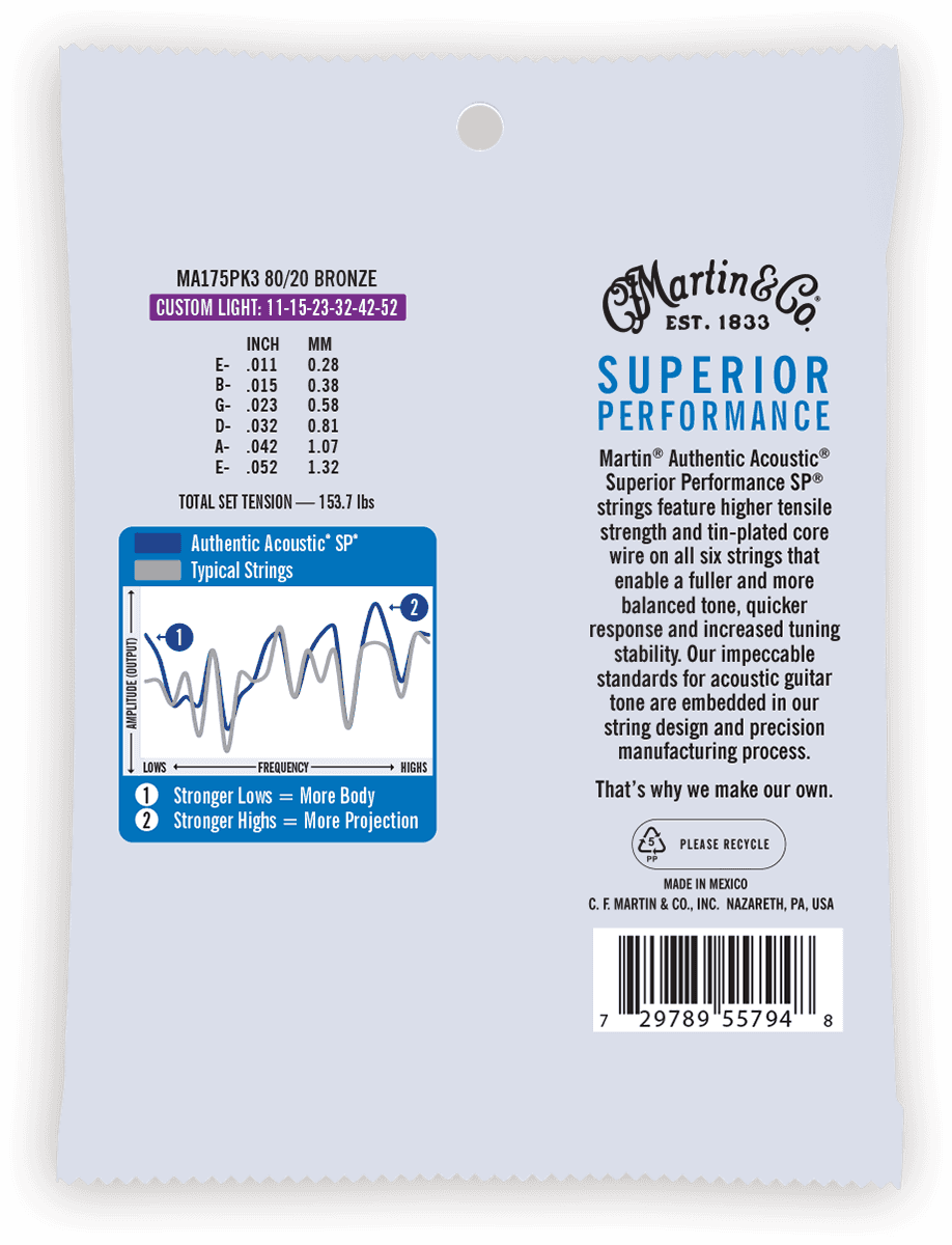 Les cordes Martin Authentic Acoustic ont été conçues pour répondre aux besoins des guitaristes. En partant d’une âme très solide, Martin a ajouté un plaquage d’étain sur les 6 cordes pour une résistance accrue à la corrosion. Elles ont ensuite été pourvues d’un filage de haute qualité qui donnera un son consistant qui durera chansons après chansons. Disponible en 80/20 Bronze et en 92/8 Phosphore Bronze.