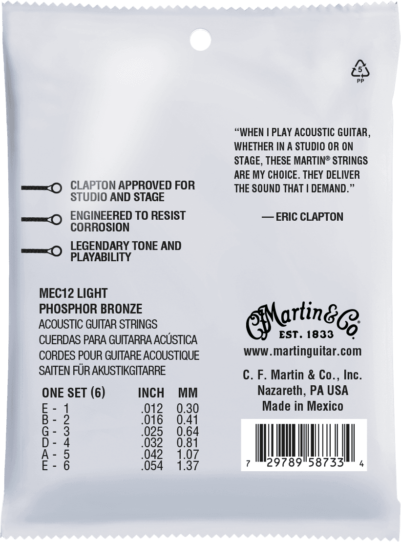 "Que ce soit pour la scène ou le studio, je choisis toujours des cordes Martin." (Eric Clapton) Et ce fut un honneur pour C.F. Martin de concevoir des cordes à son intention et d'être ainsi à l'origine d'un son légendaire.