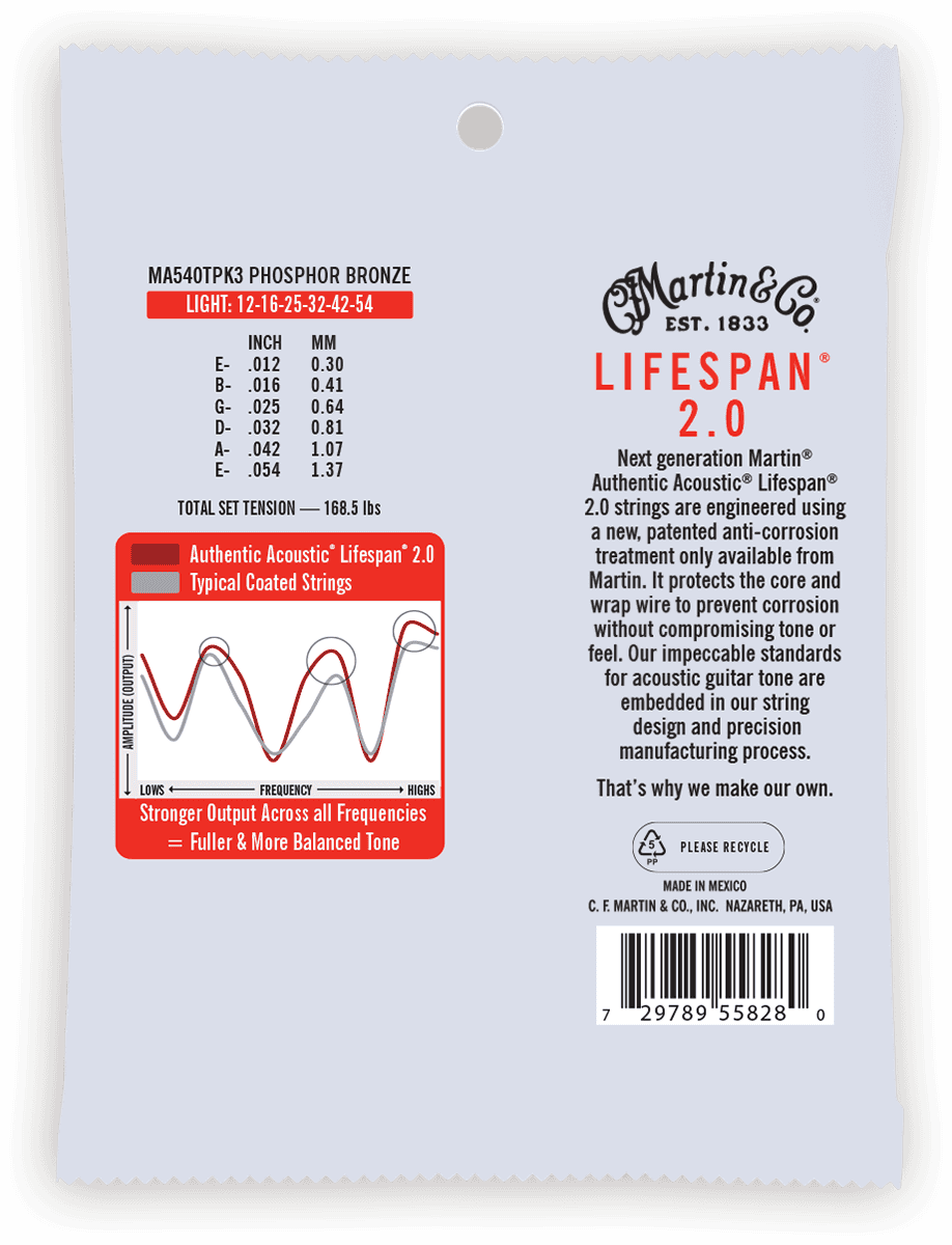 La nouvelle génération de cordes Lifespan a été conçue à partir d’une nouvelle technologie brevetée par Martin. Cette technologie permet de protéger de la corrosion à la fois l’âme et le filage de la corde sans dénaturer le son. Les Authentic Acoustic Lifespan 2.0 conservent leur aspect neuf plus longtemps, sonnent mieux et sont plus agréables au toucher. Deux ans de recherche auront été nécessaires pour permettre à Martin Guitar d’élaborer les cordes longue durée les plus performantes du marché. Disponible en 80/20 Bronze et en 92/8 Phosphore Bronze.