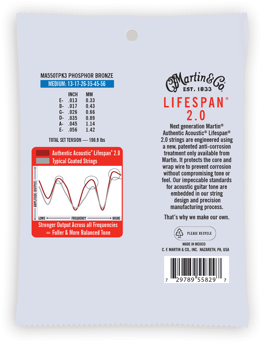 La nouvelle génération de cordes Lifespan a été conçue à partir d’une nouvelle technologie brevetée par Martin. Cette technologie permet de protéger de la corrosion à la fois l’âme et le filage de la corde sans dénaturer le son. Les Authentic Acoustic Lifespan 2.0 conservent leur aspect neuf plus longtemps, sonnent mieux et sont plus agréables au toucher. Deux ans de recherche auront été nécessaires pour permettre à Martin Guitar d’élaborer les cordes longue durée les plus performantes du marché. Disponible en 80/20 Bronze et en 92/8 Phosphore Bronze.