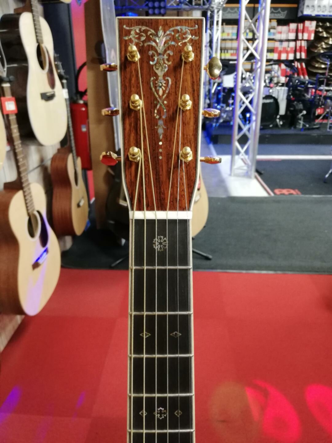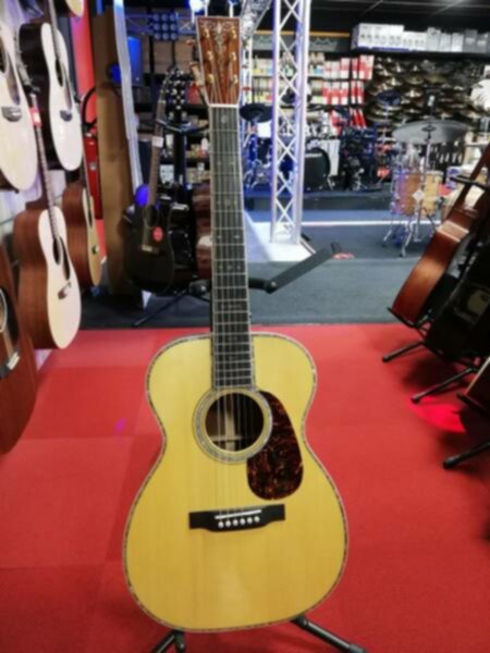 Modèle unique Custom Shop Martin Custom Shop CS-00-3130224 n°série: 2116654 -Format 00 -Epicéa Adirondack/Cocobolo -Tête: Cocobolo -Mécaniques: Gotoh Gold avec boutons Butterbean -Sillet de Tête: Os -Finition Manche: Vernis brillant -Profil du Manche: Modified V -Touche: Ebène noir -Nombre de frettes: 20 -Type de corps: 00, jonction corps/manche à la 14ème frette -Jonction corps/manche: collé, assemblé en queue d'aronde -Diapason: 632mm -Table: épicéa Adirondack -Barrage de Table: épicéa Adirondack, échancrés, 6.35mm -Finition table: vernis brillant vieilli -Rosace: style 45 -Dos: Cocobolo -Filet Dos: Style 45 mosaic pattern -Eclisses: Cocobolo -Finition Dos et Eclisses: vernis brillant -Filet de table: érable européen flammé -Chevalet: ébène noir -Type de chevalet: posé, style Modern Belly -Sillet de chevalet: compensé en os, radius 406mm -Cordes recommandées: MA540T -Etui: Type 534 Cabernet