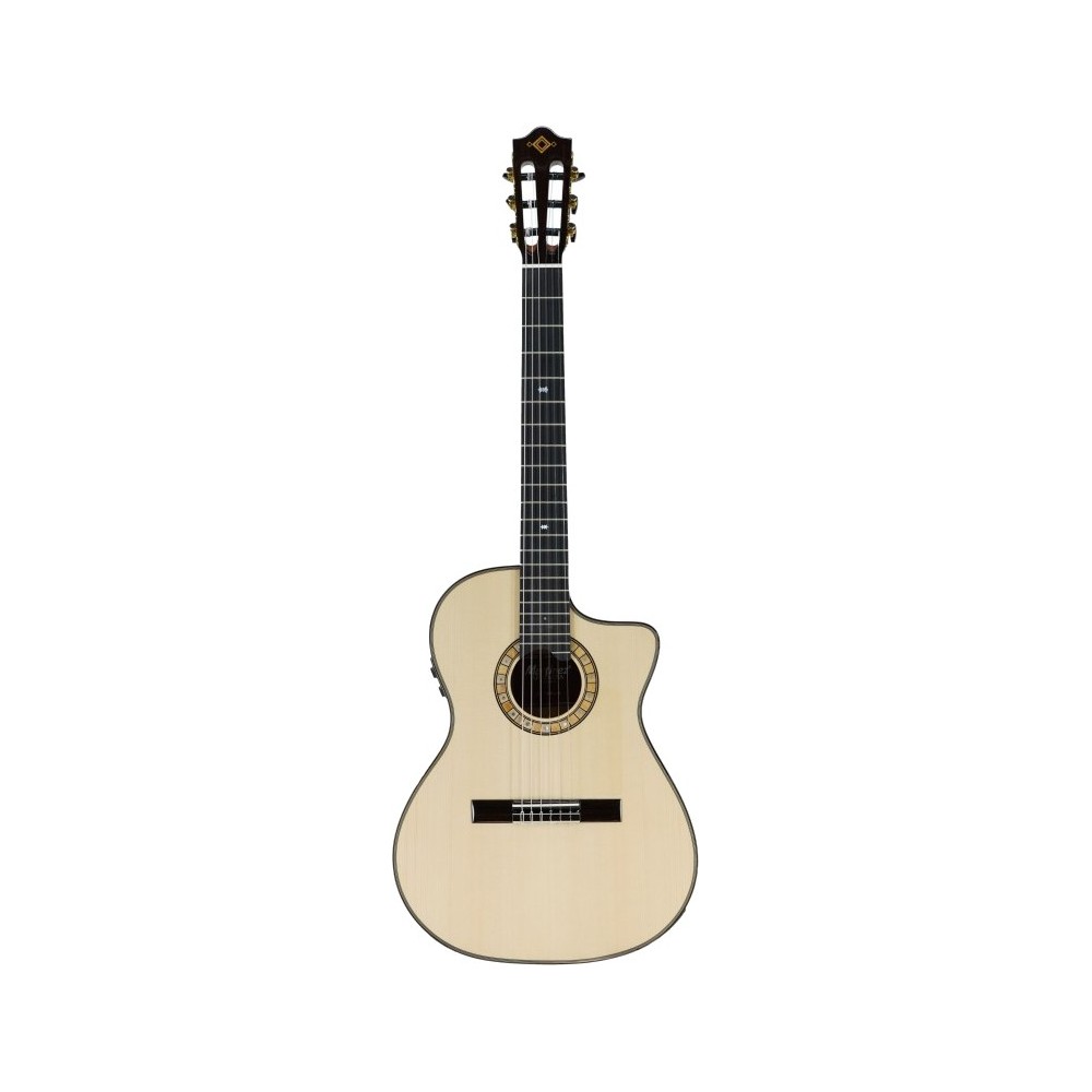 Guitare classique électro MARTINEZ Crossover MP14-MP avec table en Epicéa massif, dos/éclisses érable et touche Ebène est un modèle hybride avec une caisse plus compacte que le traditionnel 4/4 et un manche moins large avec